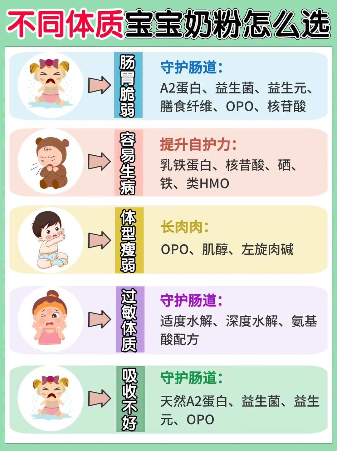5️⃣吸收不好的:选择配方含有天然A2蛋白、益生菌、益生元、OPO