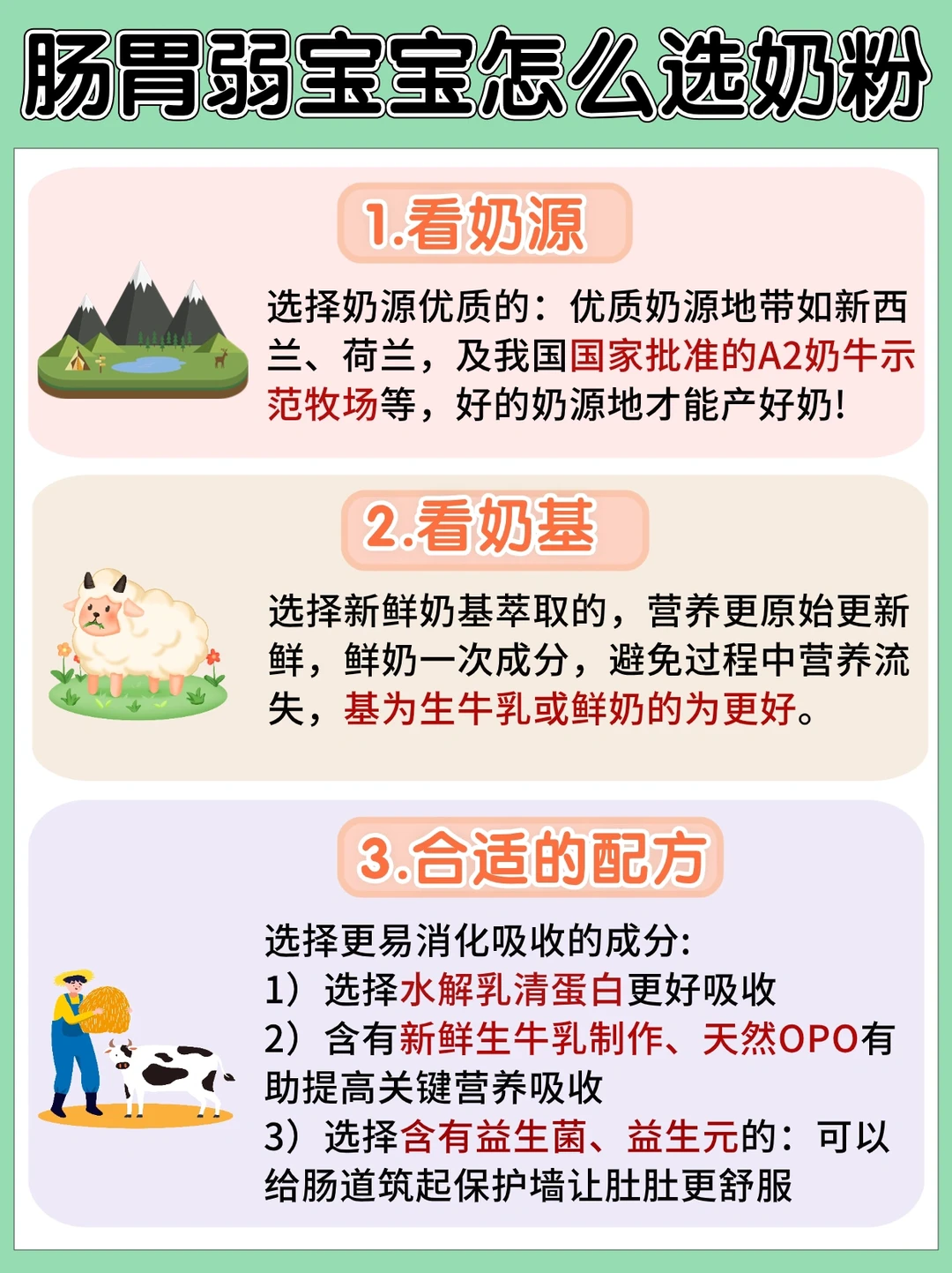 1️⃣肠胃脆弱的:选择配方含有A2蛋白、益生菌、益生元.膳食纤维、OPO