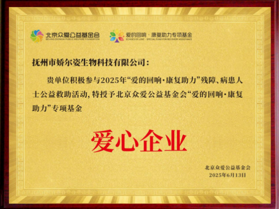 2025年6月15日,抚州市娇尔姿生物科技有限公司(以下简称“娇尔姿”)在2025年度“爱的回响 康复助力”残障、病患人士公益救助活动中表现突出,被北京众爱公益基金会特授予“‘爱的回响 康复助力’专项基金爱心企业”荣誉称号。这一荣誉不仅是对娇尔姿积极践行企业社会责任、热心投身公益事业的充分肯定,更彰显了其助力弱势群体康复、传递社会温暖的坚定承诺。