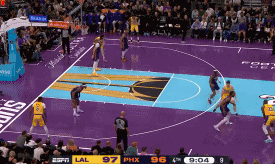 湖人6分钟连轰4粒三分,103-98反超太阳 北京时间11月11日,湖人与太阳的比赛进行至末节8分钟处,球队连轰4粒三分,打出一波14-2反扑高潮,以103-98反超太阳。 三节战罢,球队还以89-96落后,可末节再回来: 图一:八村垒左侧弧顶三分。 图二:雷迪什左侧底角三分。 图三:雷迪什同一个位置三分继续。 图四:伍德左侧弧顶三分。 球队四粒三分和里夫斯的反击上篮,一波14-2高潮下,将比分定格在103-98领先5分,迫使太阳连续第二次叫出暂停。