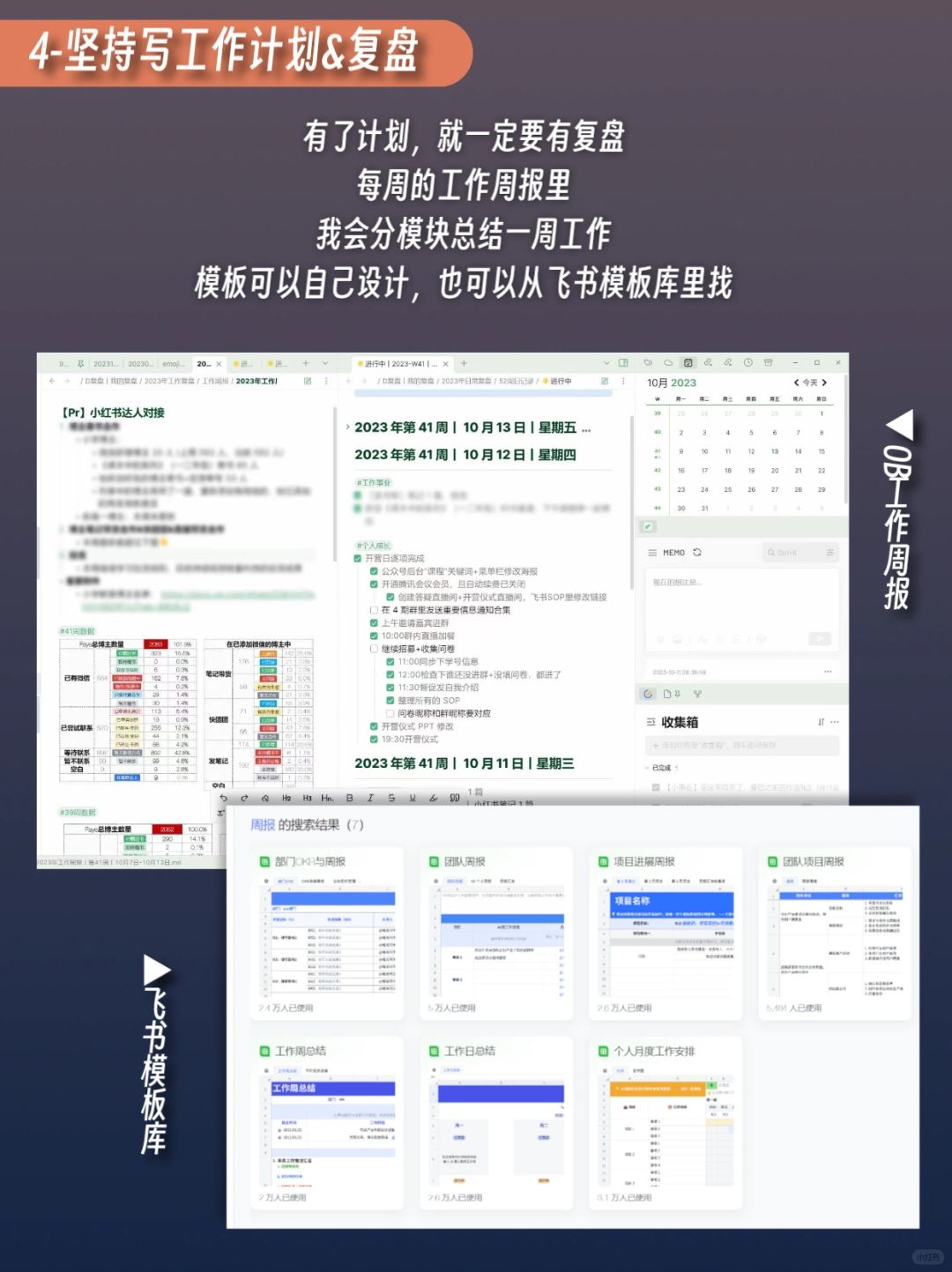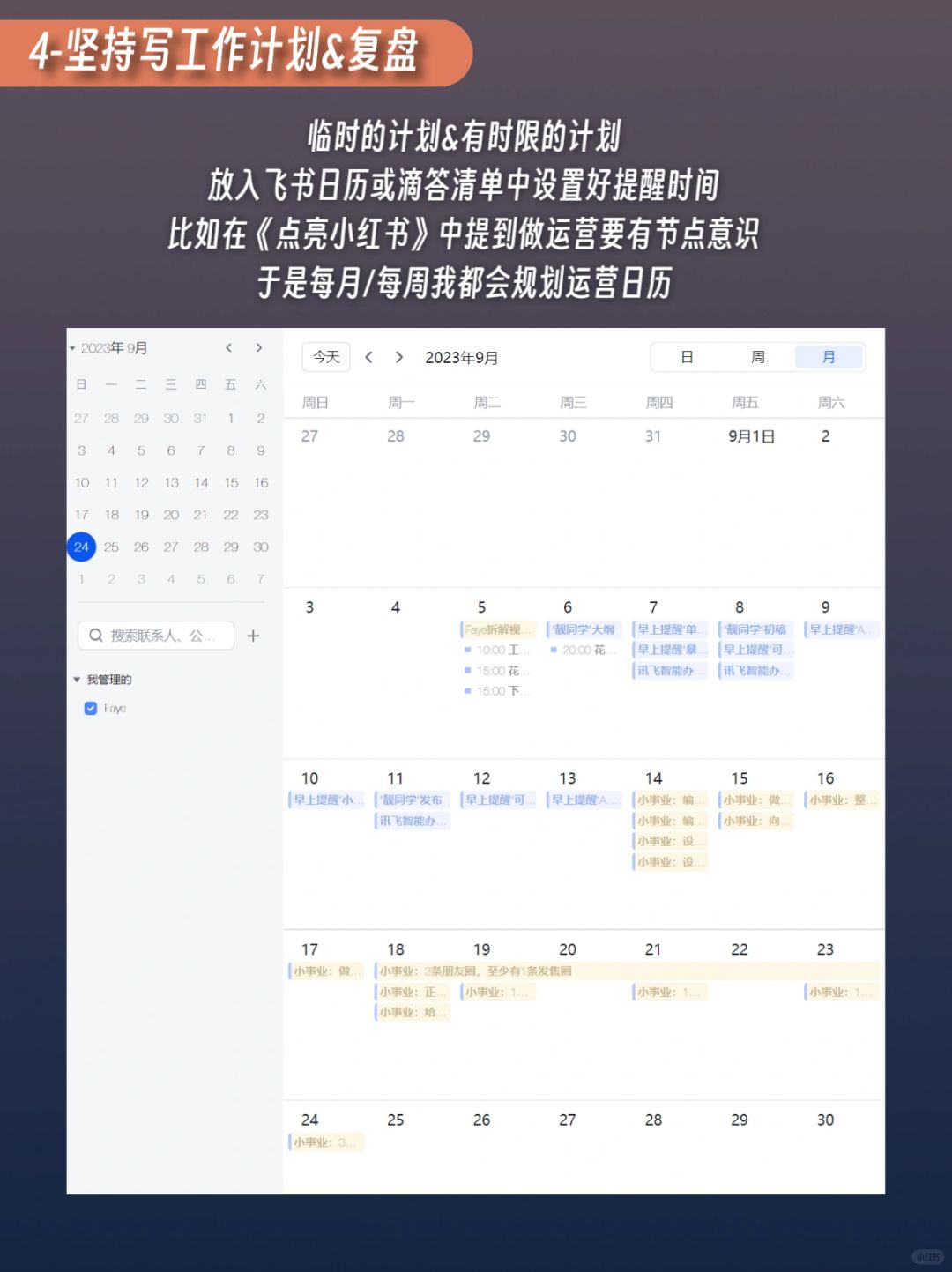 ❹写目标&复盘:根据《点亮》中提到的运营节奏规划,我每月/每周都会规划运营日历,每周写工作周报复盘,这样全团队效率都很高。