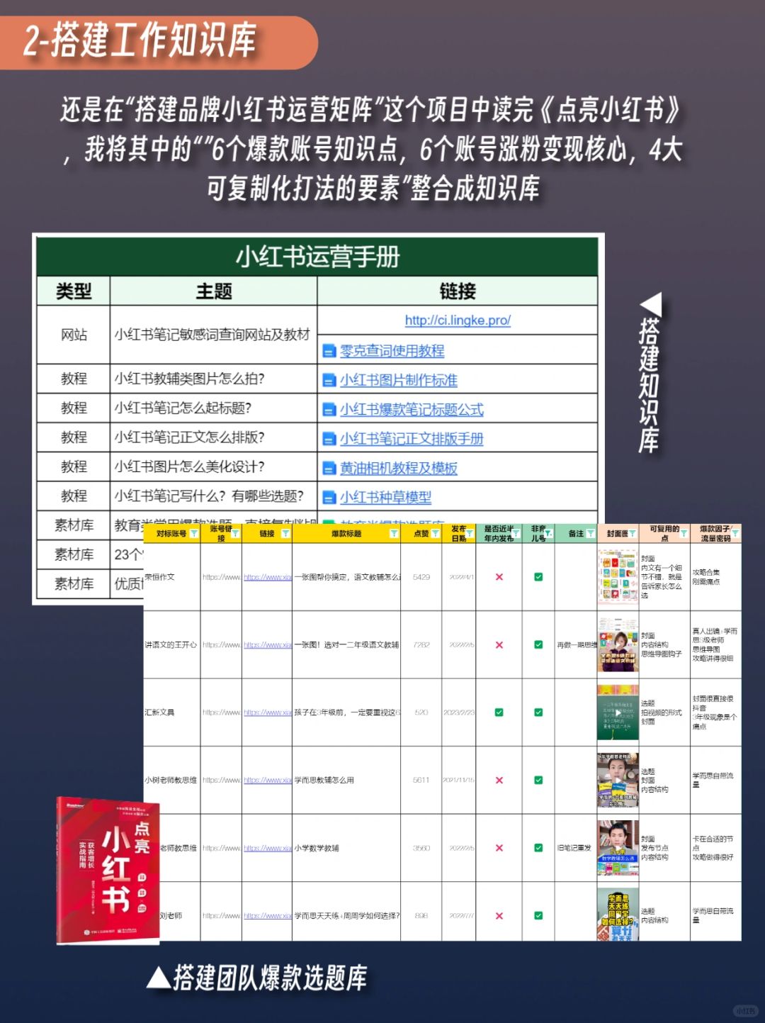 ❷搭建知识库:读完《点亮》,我将其中的“”6个爆款账号知识点,6个账号涨粉变现核心,4大可复制化打法的要素”整合成知识库,包括爆款选题库、笔记制作教程、赛道分析等十多个文档,可以快速教会数百人。