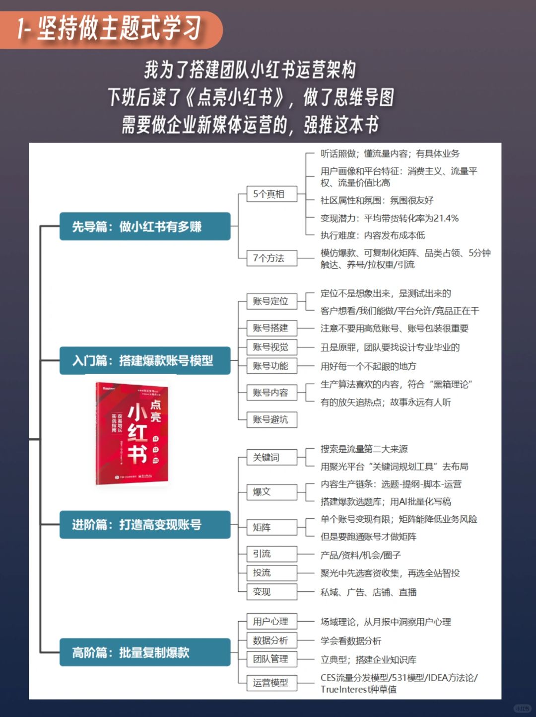 ❶主题式学习:我为了搭建团队运营架构,下班后读了《点亮》,做了思维导图后共享给团队小伙伴。这本书真的非常适合新媒体运营读,做思维导图又能快速理清架构。