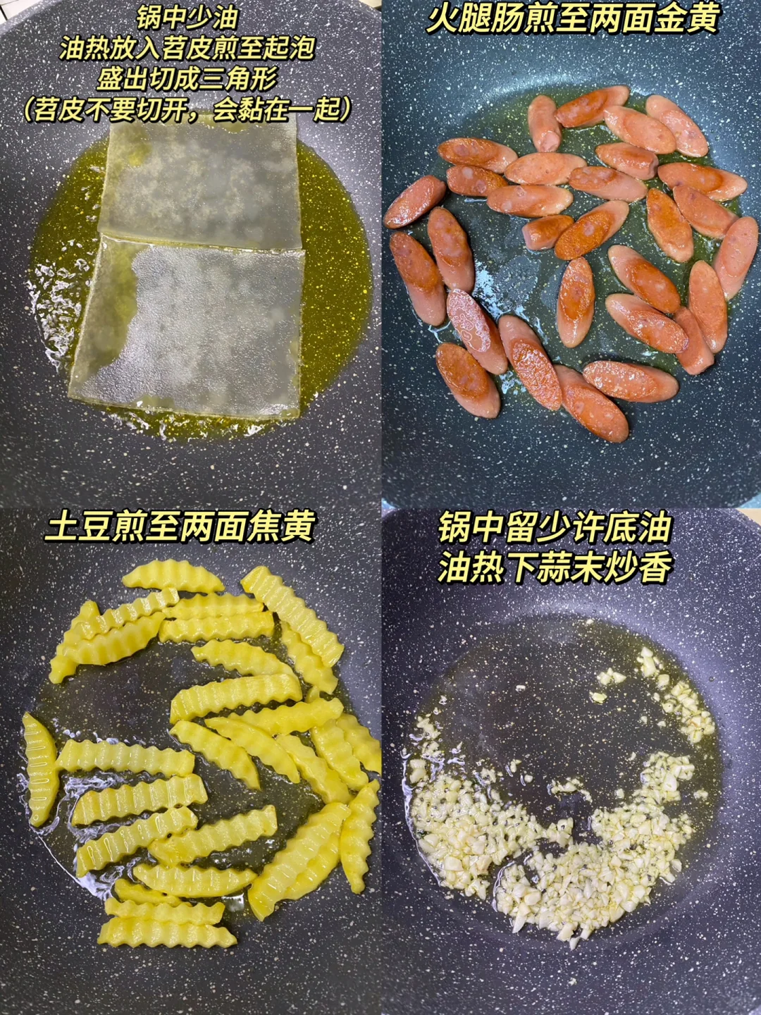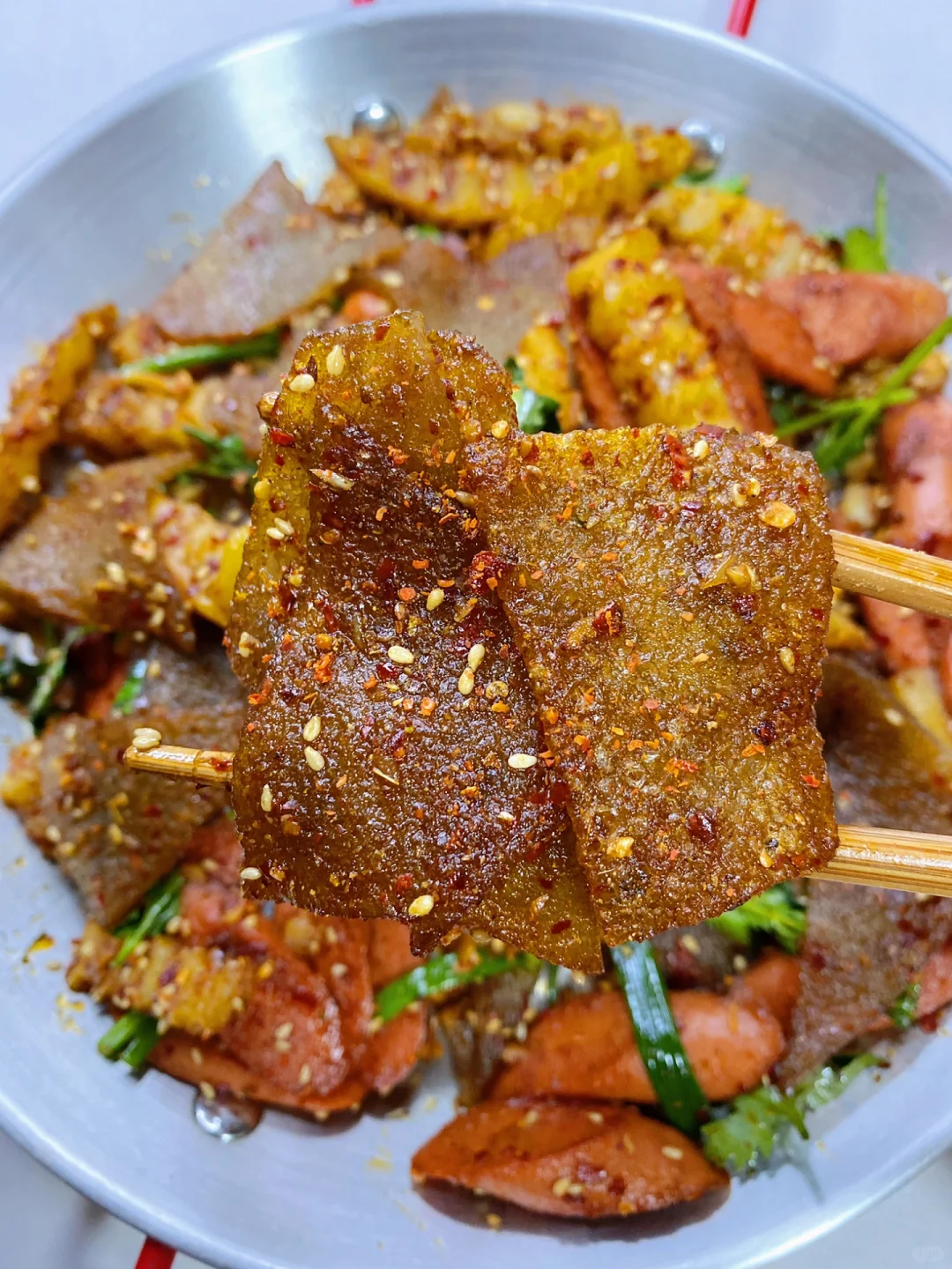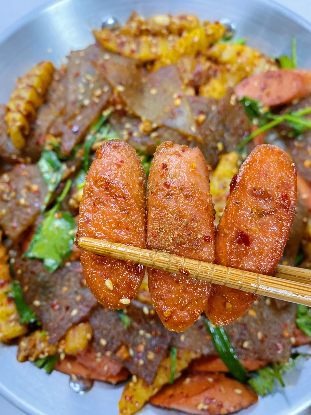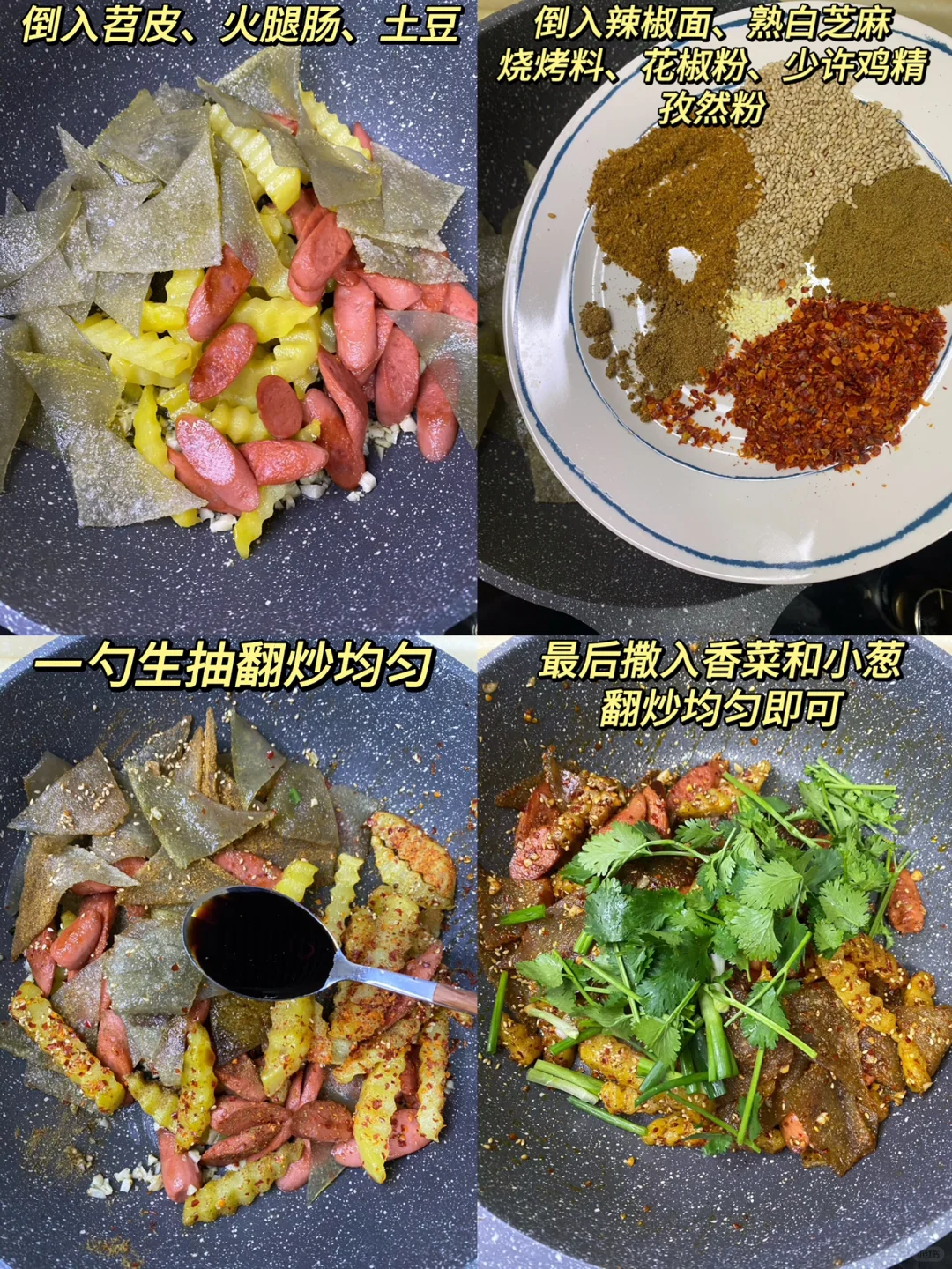 🍃食材: 火腿肠、苕皮、土豆、香葱、香菜、蒜末 🍃做法: 1、锅中倒入少许油,油热下入苕皮煎至冒泡盛出,火腿肠煎至两面金黄盛出,土豆煎至两面金黄盛出。 2、锅中留少许油,油热下入蒜末炒香,倒入苕皮、火腿肠、土豆,倒入烧烤料➕少许花椒粉➕熟白芝麻➕少许鸡精➕辣椒面➕孜然粉➕一勺生抽翻炒均匀,撒入香菜和小葱翻炒均匀。