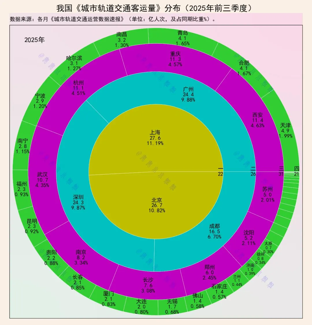 图表最外环的“其他城市”群体,虽然单个客运量占比不大,但同样具有重要意义。它们代表了更多正处于轨交网络发展初、中期的城市。其客运量规模与城市现有线网长度、人口密度直接相关,展现了不同发展阶段城市的公共交通发展面貌。