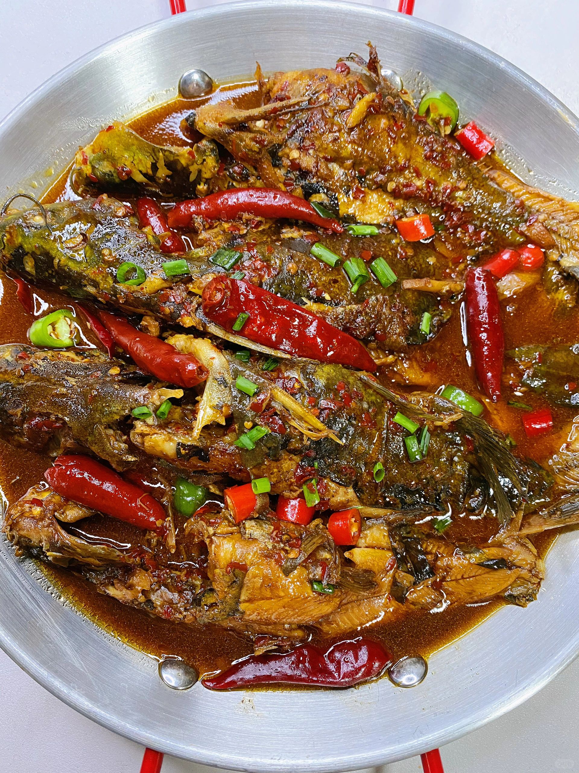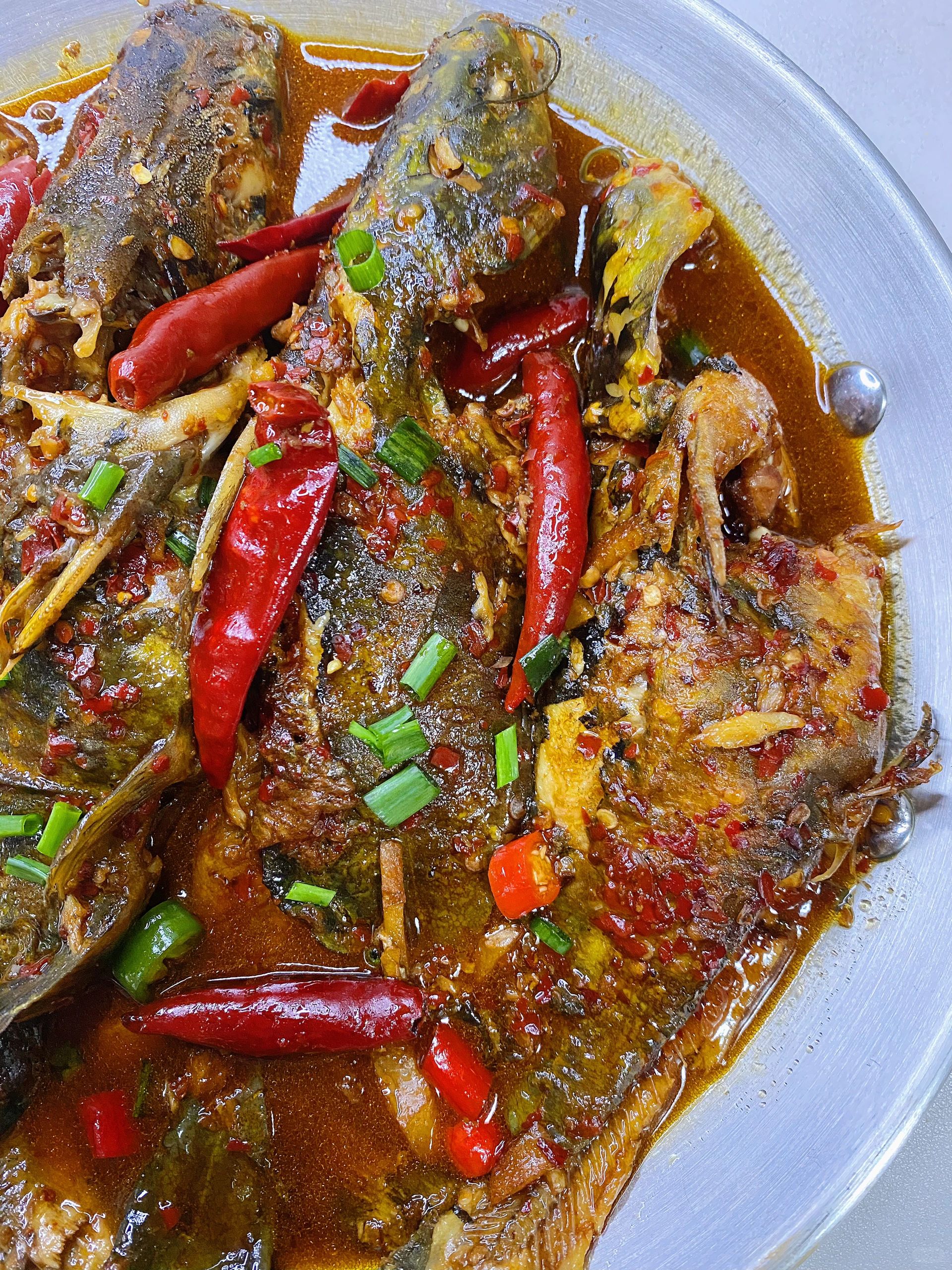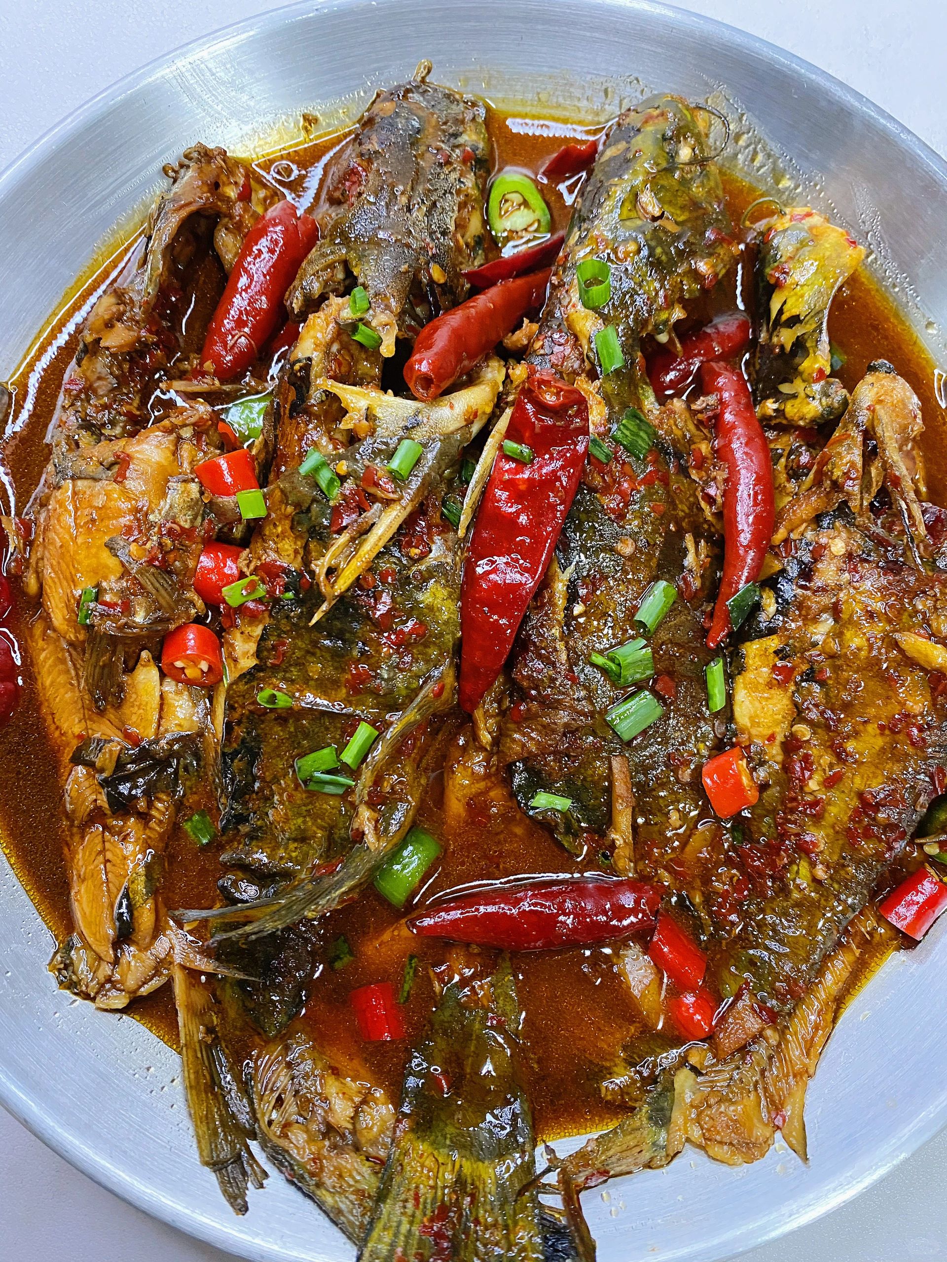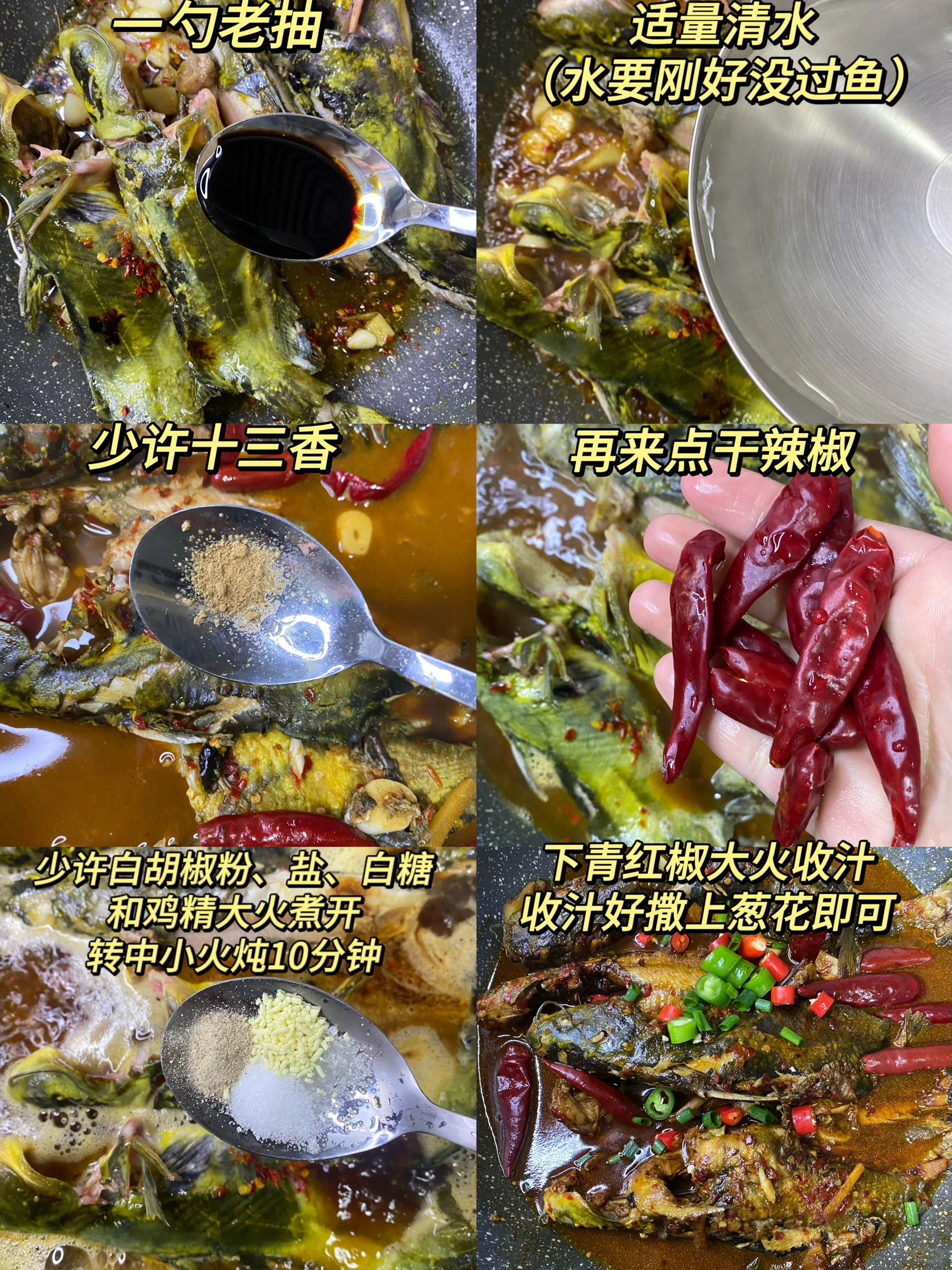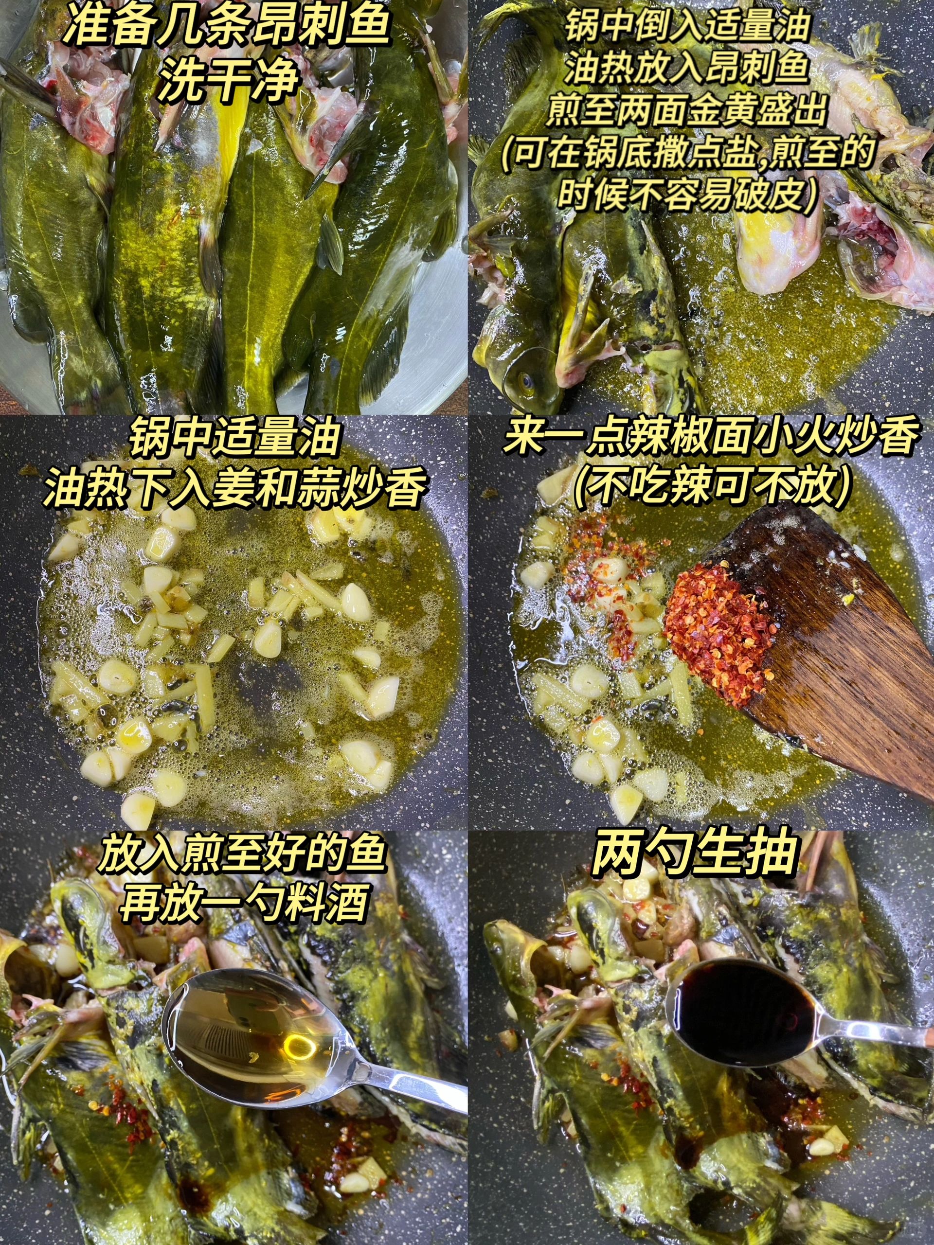 🍃食材: 昂刺鱼、青红椒、葱姜蒜、干红辣椒 🍃做法: 1、昂刺鱼清洗干净,青红椒切圈,葱姜蒜切好备用。 2、锅中倒入适量油,锅底可放点盐(以免粘锅),下入昂刺鱼煎至两面金黄盛出。 3、锅中适量油,油热下入姜蒜炒香,放一勺辣椒面小火炒香(不吃可不放),放入煎至好的鱼,➕一勺料酒➕两勺生抽➕一勺老抽➕适量清水(水要刚好没过鱼),再放少许十三香➕几个干红辣椒➕少许白胡椒粉、少许白糖、鸡精和盐,大火煮开后转中小火煮10分钟,煮好后撒入青红椒大火收汁,最后撒入葱花即可。