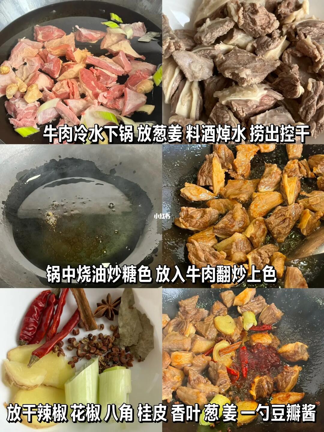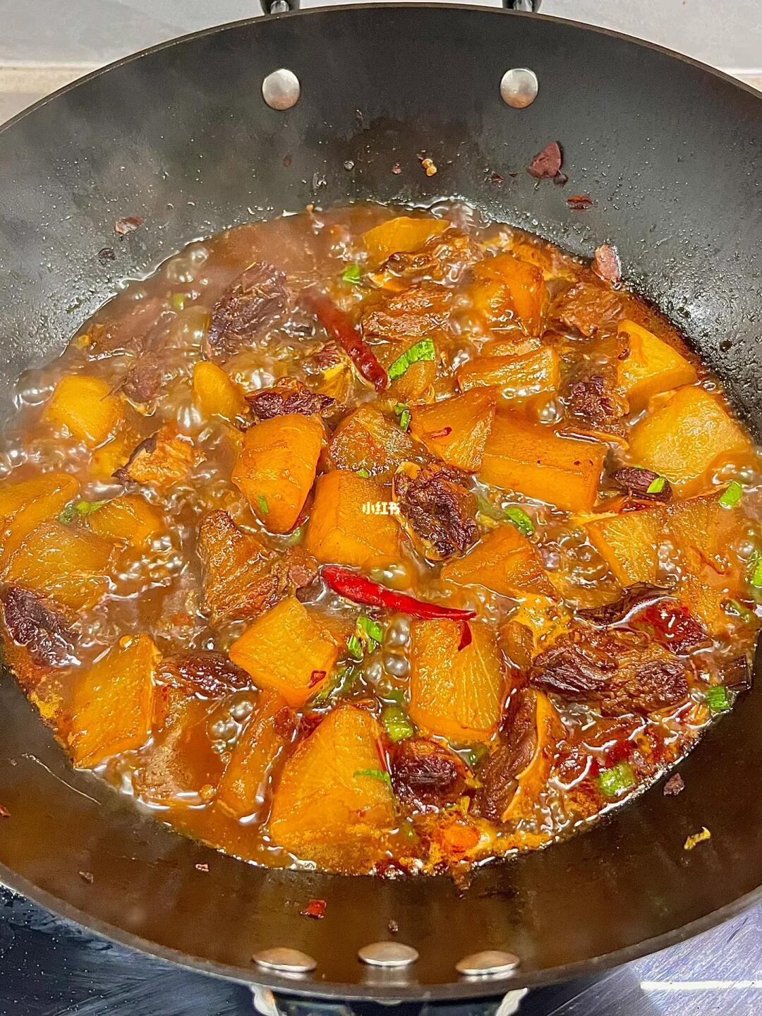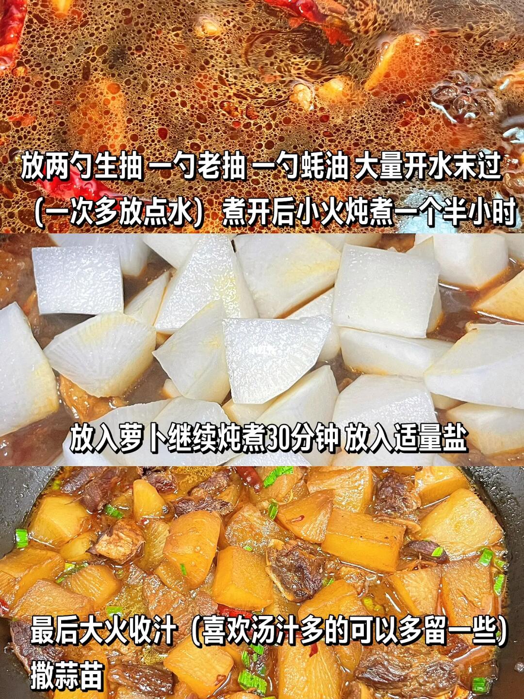 冬天最爱的一道菜!🔥 - 🌟食材: 牛肉(牛腩、牛肋条都可以)、白萝卜 🌟步骤: 1⃣️牛肉冷水下锅,放葱、姜、料酒焯水,捞出沥开水分 2⃣️锅中放油炒糖色,放入牛肉翻炒,放入干辣椒、花椒、八角、香叶、桂皮、姜、葱,一勺豆瓣酱翻炒 3⃣️倒入开水末过牛肉(多放一些),放入两勺生抽、一勺老抽、一勺蚝油煮开后转小火炖煮一个半小时 4⃣️放入萝卜、适量盐继续炖煮30分钟,稍微收汁(喜欢汤汁多的可以不收)撒蒜苗✅