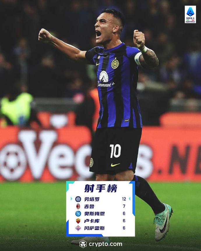 意甲:国际米兰,劳塔罗:12球,26岁,身价1亿欧元;1个点球;进球间隔82分钟;