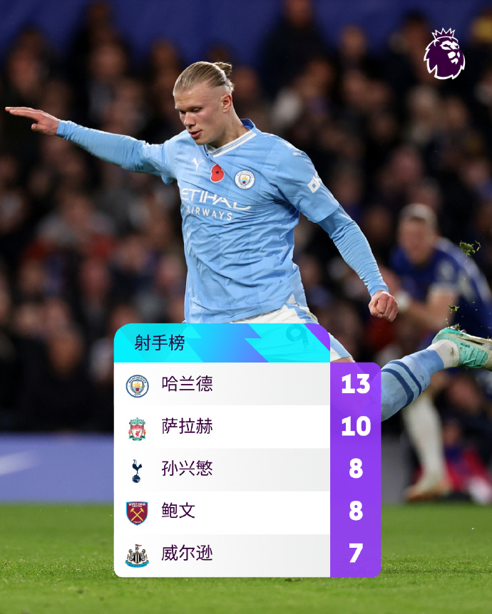 英超:曼城,哈兰德:13球,23岁,身价1.8亿欧元;3个点球;进球间隔79分钟;