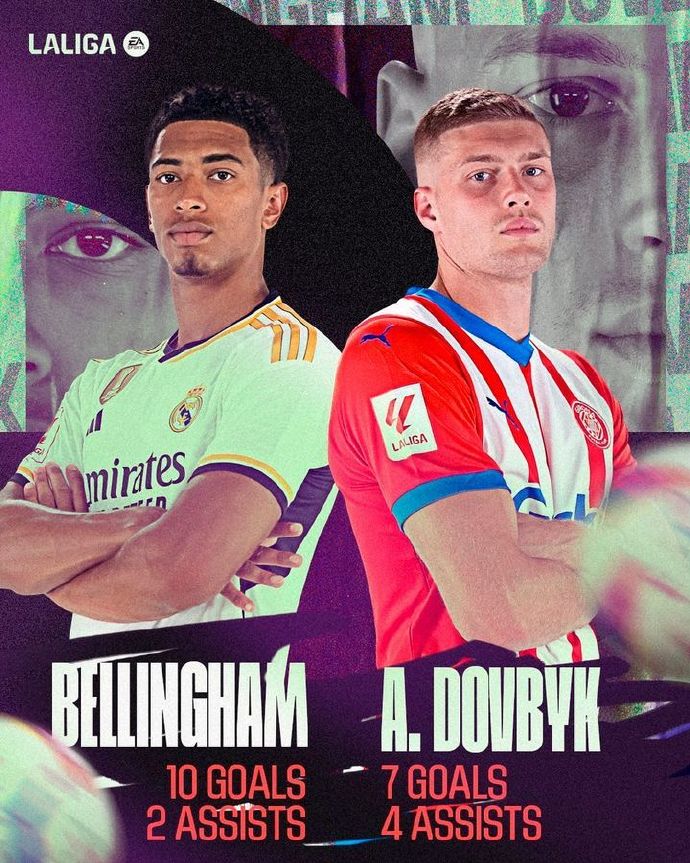 西甲:皇家马德里,贝林厄姆:10球,20岁,身价1.5亿欧元;无点球;进球间隔95分钟;