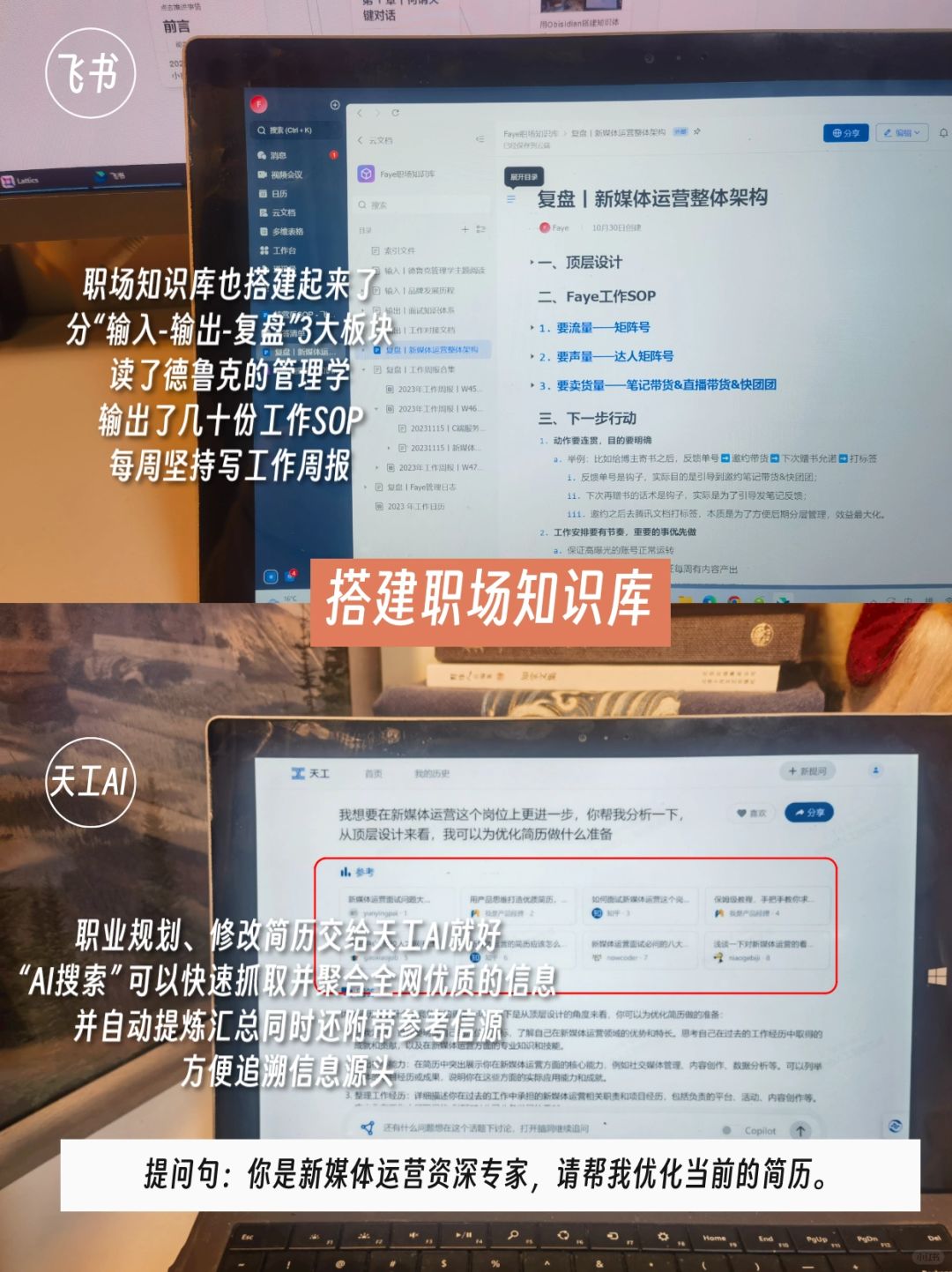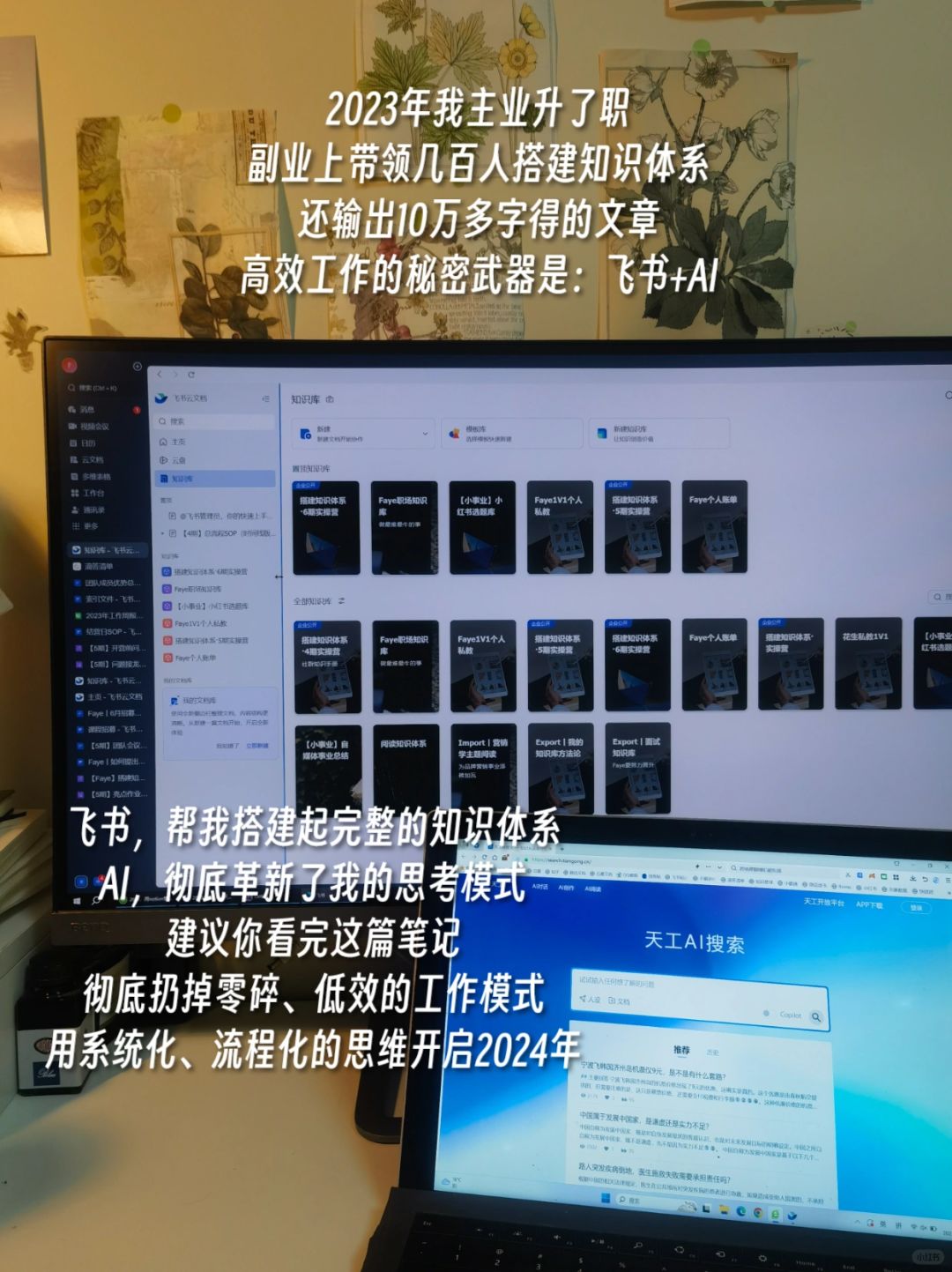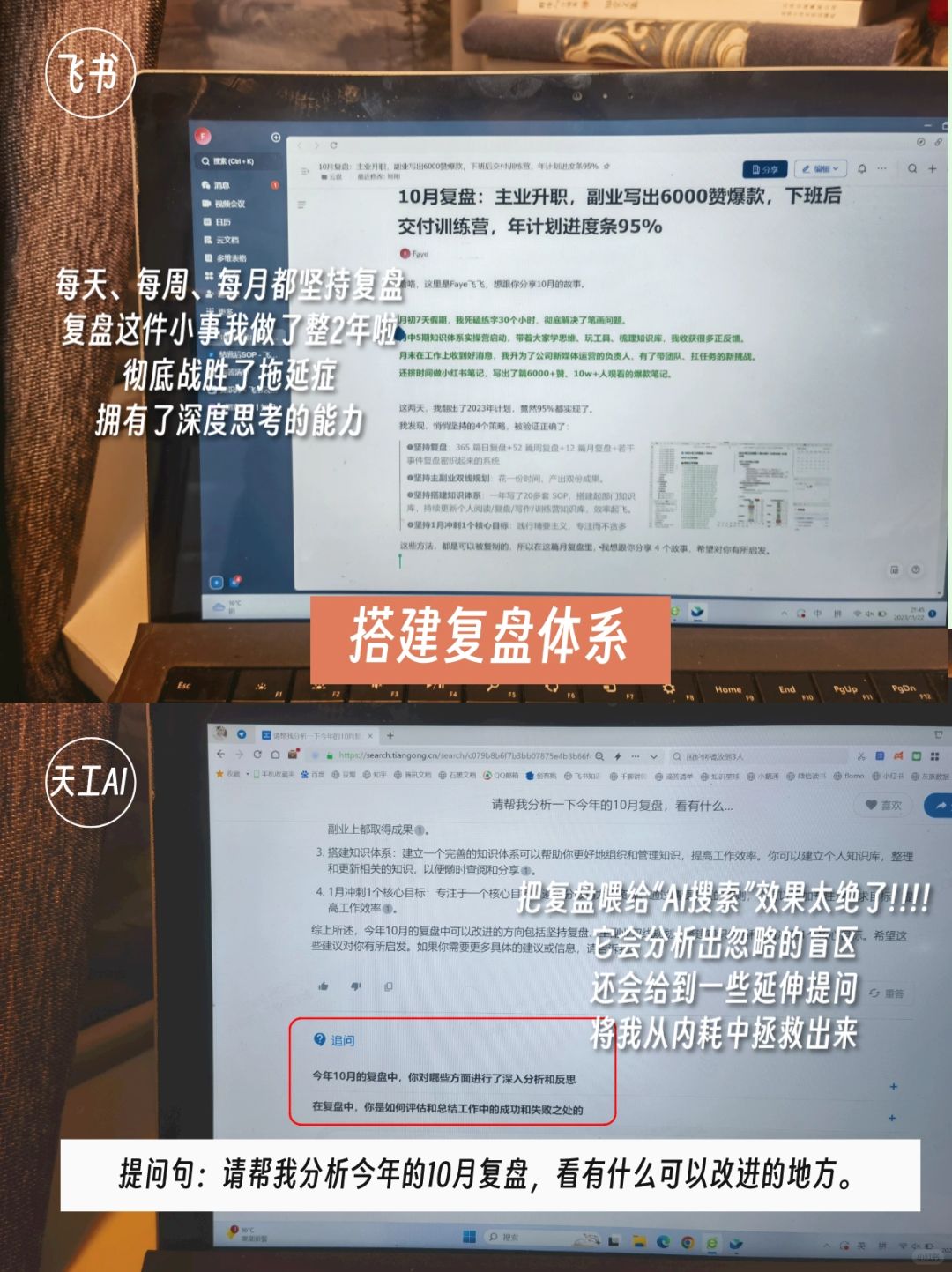 2023年我主业升了职,副业上带领几百人搭建知识体系,还输出10万多字得的文章,高效工作的秘密武器是:飞书+天工 AI 。 . 可以说,随着 AI +效率工具井喷, 我们一定要转变单打独斗的思维, 借助工具+系统化思维,搭建起职业护城河来,而且像天工 AI 这类工具是免费无限次提问的,飞书也有 100 G 免费空间,对职场人很友好。 . 今天,我来分享 5 个场景,分享半年来在这 2 个工具+搭建知识体系思维的加持下,我是如何从摆烂的小透明逆袭的: . 1⃣ 日程规划&年度计划 飞书:制作年度计划,并落实到每周、每月,可以用进度条显示计划完成率。 AI:用天工 AI 的“AI 搜索”功能,可以分析自己年度计划是否合理,并找到对应的分析模型来源。 . 2⃣ 搭建职场知识库 飞书:用知识库功能,分“输入-输出-复盘”3大板块,读了德鲁克的管理学,输出了几十份工作 SOP ,每周坚持写工作周报。 AI:用天工 AI 的“AI 搜索”功能,站在资深专家的角度,帮我分析行业发展、顶层设计。 . 3⃣ 保持简历更新 飞书:飞书的文档排版功能很强大,可以排出超好看的简历或作品集!我今年一直在更新主副业的作品~ AI:工作上我研究了天工 AI 的“AI 创作”功能,只要命令词足够准,AI 搞文案/PPT 创作效率真的很高。 . 4⃣ 搭建复盘体系 飞书:创建复盘知识库,每天、每周、每月的复盘都坚持写,这件小事我坚持了 2 年,整个人从思维到行为上都脱胎换骨。 AI:把复盘喂给 AI, 它会分析出忽略的盲区,将我从内耗中拯救出来。 . 5⃣ 下班后搞副业 飞书:用飞书多维表+知识库搭建课程内容库,可以跟踪每一项计划进程+沉淀 SOP,真的超赞 AI: ​AI 储备了大量营销/心理学知识,用来拓展副业思路超棒,我喜欢用天工 AI 的“AI 对话”功能,可以聊得更深入。 . 如何你对飞书/天工 AI ,有其他问题或者好玩的点子,欢迎来一起分享~