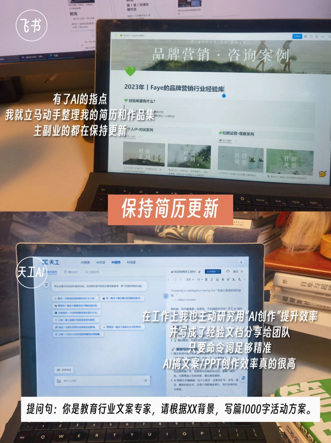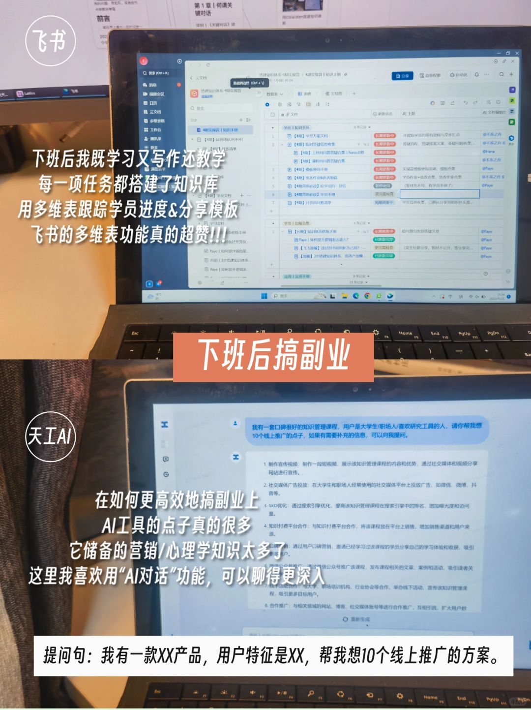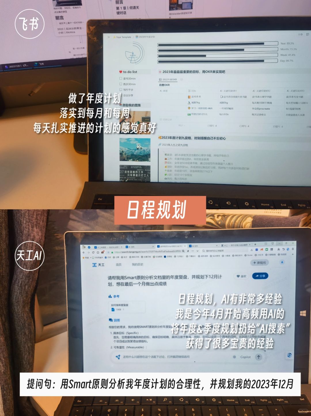 2023年我主业升了职,副业上带领几百人搭建知识体系,还输出10万多字得的文章,高效工作的秘密武器是:飞书+天工 AI 。 . 可以说,随着 AI +效率工具井喷, 我们一定要转变单打独斗的思维, 借助工具+系统化思维,搭建起职业护城河来,而且像天工 AI 这类工具是免费无限次提问的,飞书也有 100 G 免费空间,对职场人很友好。 . 今天,我来分享 5 个场景,分享半年来在这 2 个工具+搭建知识体系思维的加持下,我是如何从摆烂的小透明逆袭的: . 1⃣ 日程规划&年度计划 飞书:制作年度计划,并落实到每周、每月,可以用进度条显示计划完成率。 AI:用天工 AI 的“AI 搜索”功能,可以分析自己年度计划是否合理,并找到对应的分析模型来源。 . 2⃣ 搭建职场知识库 飞书:用知识库功能,分“输入-输出-复盘”3大板块,读了德鲁克的管理学,输出了几十份工作 SOP ,每周坚持写工作周报。 AI:用天工 AI 的“AI 搜索”功能,站在资深专家的角度,帮我分析行业发展、顶层设计。 . 3⃣ 保持简历更新 飞书:飞书的文档排版功能很强大,可以排出超好看的简历或作品集!我今年一直在更新主副业的作品~ AI:工作上我研究了天工 AI 的“AI 创作”功能,只要命令词足够准,AI 搞文案/PPT 创作效率真的很高。 . 4⃣ 搭建复盘体系 飞书:创建复盘知识库,每天、每周、每月的复盘都坚持写,这件小事我坚持了 2 年,整个人从思维到行为上都脱胎换骨。 AI:把复盘喂给 AI, 它会分析出忽略的盲区,将我从内耗中拯救出来。 . 5⃣ 下班后搞副业 飞书:用飞书多维表+知识库搭建课程内容库,可以跟踪每一项计划进程+沉淀 SOP,真的超赞 AI: ​AI 储备了大量营销/心理学知识,用来拓展副业思路超棒,我喜欢用天工 AI 的“AI 对话”功能,可以聊得更深入。 . 如何你对飞书/天工 AI ,有其他问题或者好玩的点子,欢迎来一起分享~