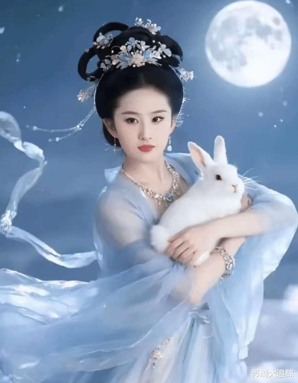 即是嫦娥美人比拼,自是少不了我们的神仙姐姐刘亦菲了,她身着蓝色纱裙,怀抱玉兔或静立望月,气质清冷,眼神含愁,衣袂翩翩,古韵十足,若真有广寒宫,嫦娥也该是她这样的吧!