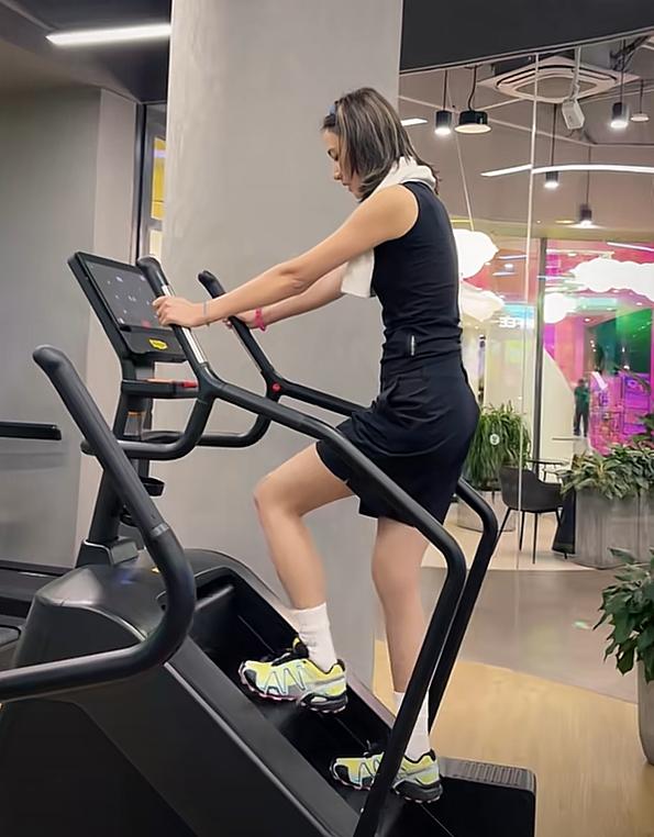 她在健身房的跑步机、滚轴、坐推架、动感单车、爬楼机上轮番锻炼。