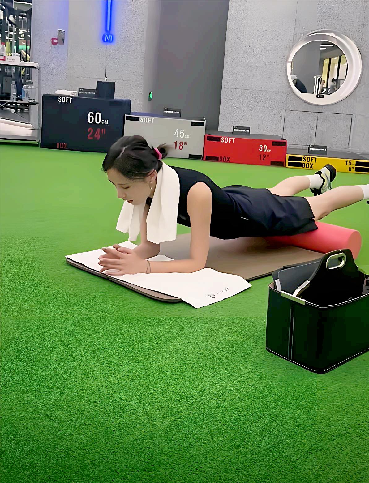 旁边没有教练,但她的动作标准、规范,配合恰到好处的吸气、呼气,一看就是高度自律的资深“健身控”。