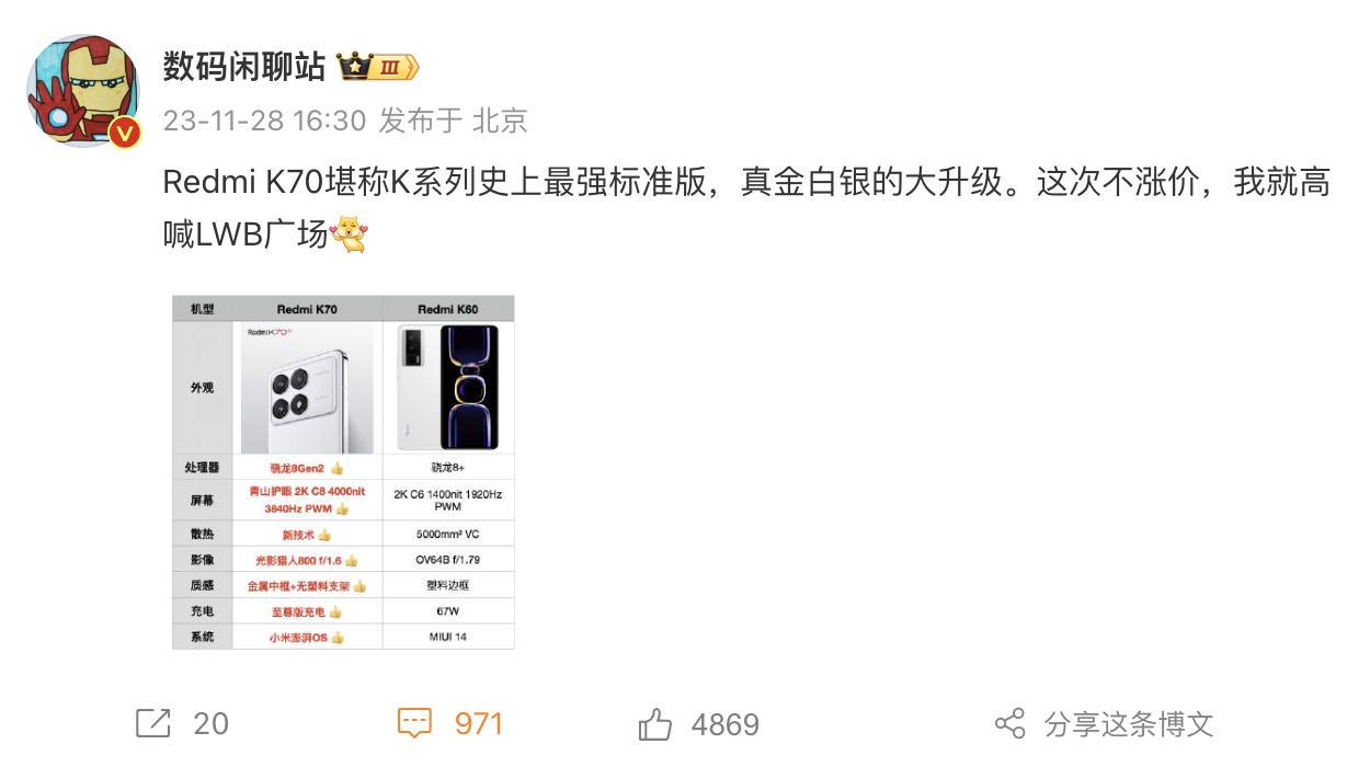 五大领域全面升级,小米下了大手笔,打造Redmi K系列史上最强标准版,消费者购机终于可以按预算下单了。 Redmi K70首先迎来了性能跨越式升级,引入狂暴引擎3.0,释放最强的8550性能,在小米澎湃OS的AI能力加持下,软硬协同达到性能释放最优解。屏幕方面,Redmi K70迎来最强亮度、最强色准、最强护眼三大跨越性升级,尤其是该系列首次采用小米“青山护眼屏”技术,护眼问题得到根本性解决。 在影像方面的升级是我没有想到的,Redmi K70挂接小米14同宗同源的技术,集团影像直接赋能Redmi,标准版影像能力也迎来史诗级提升,搭配夜枭算法和DXG超强动态,夜拍效果无敌,整体上效果跟IMX890打得有来有回。质感方面的升级不能忽视,Redmi K70采用金属中框和直屏里边,质感手感同步升级,完成K系列史上最美标准版的蜕变,要说Redmi的设计师应该发奖金了。 同时推出的一系列手机型号,不知道该买哪一款是很多消费者头疼的事情,原因就是很多手机厂商在做这一代机型的时候,把标准版阉割得不成样,导致预算不高买标准版有点冤,被迫用更高的预算去买高版本。这一现象将被五大领域全面升级的Redmi K70打破。