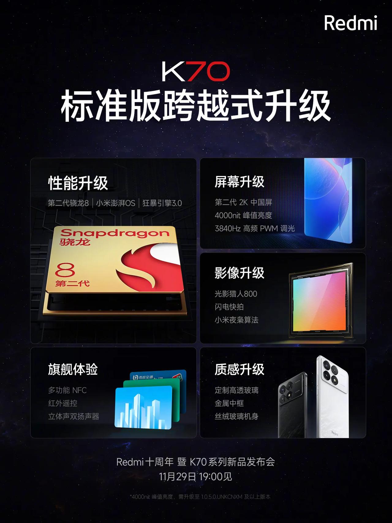 红米跟兰博基尼跑车合作,别看调门很高,其实标准版才是我关心的,这次标准版迎来五大领域全面升级,小米打造Redmi K系列史上最强标准版。 第一,性能跨越式升级,引入狂暴引擎3.0,加持小米澎湃OS的AI能力,软硬协同表现优秀。 第二,屏幕跨越式升级,最强亮度、最强色准、最强护眼三大跨越性升级,采用小米“青山护眼屏”技术,解决了护眼问题。 第三,影像跨越式升级,Redmi K70 采用小米14 相同技术,标准版影像能力迎来显著提升,其中夜枭算法和DXG超强动态助力无敌夜拍效果。 第四,质感跨越式升级,Redmi K70采用金属中框和直屏里边,质感手感都得到升级,K系列标准版也可以这么好看。 第五,旗舰体验升级,多功能 NFC、红外传感器、立体双扬声器都安排了。 总之,这是一代值得买的标准版,2499 元起,真不贵。