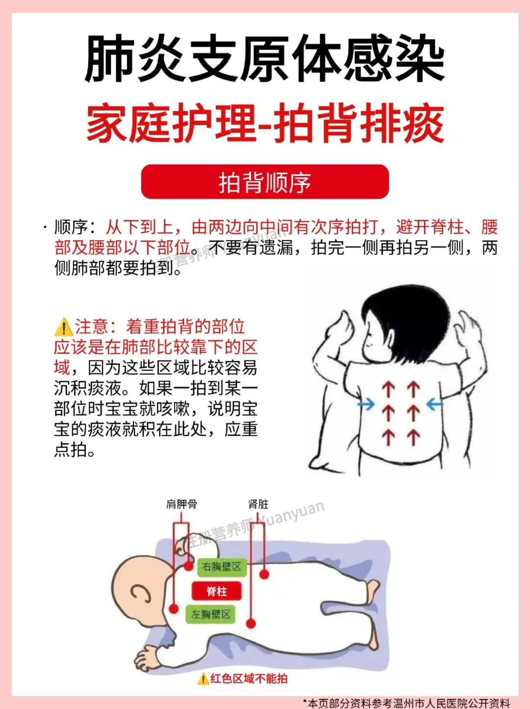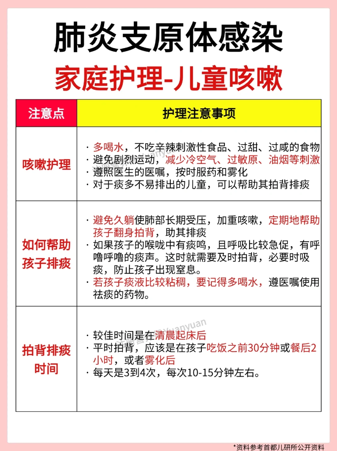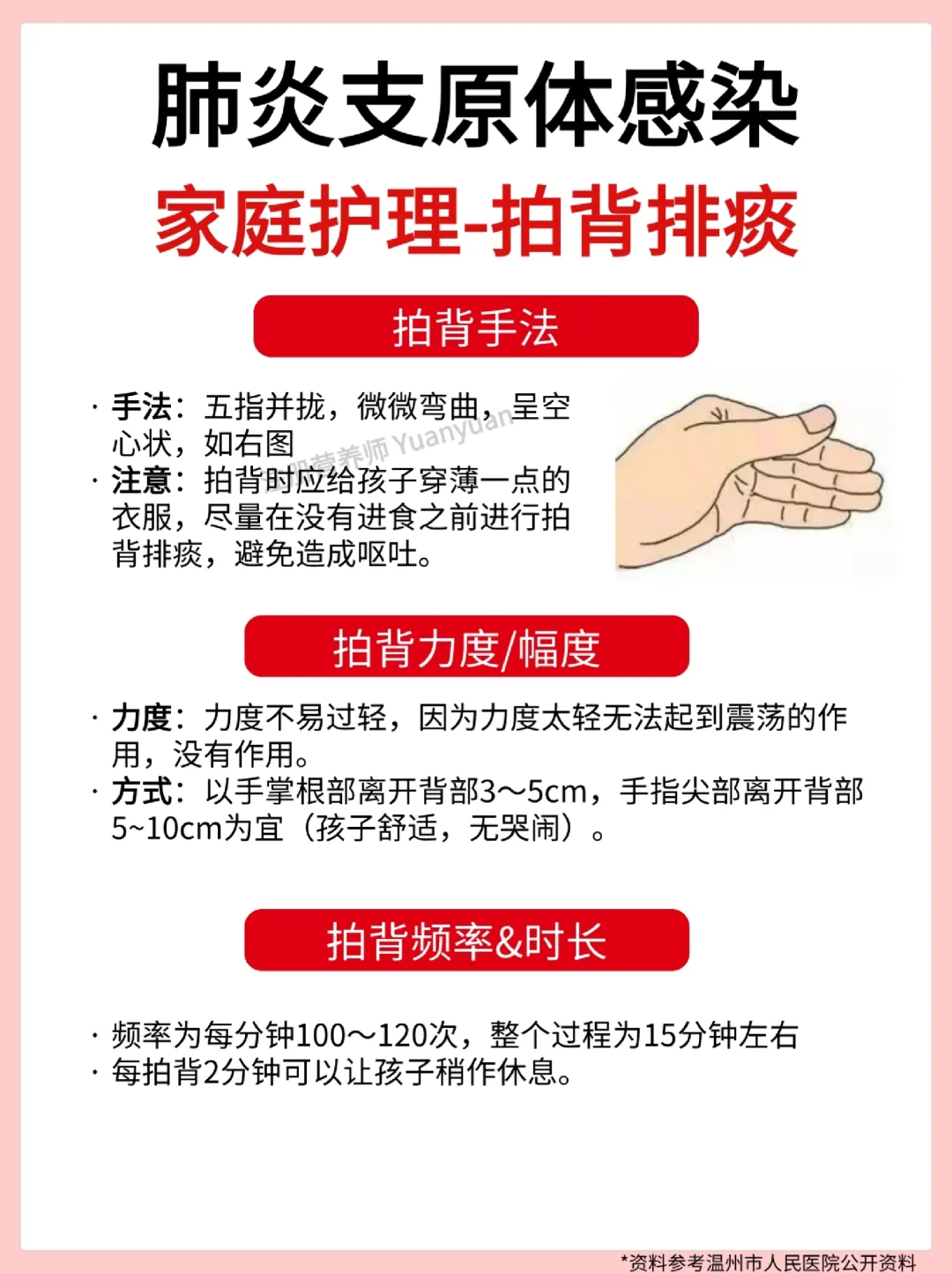 支原体肺炎和流感来势汹汹,我们小区也有不少小朋友中招了。 支原体感染撞上流感季,真的是宝爸宝妈们的大劫难。 上次分享的支原体肺炎食谱大家说很有用,这次把食谱具体的注意事项和娃中招后的家庭护理也整理出来了,供参考。 *护理事项资料的来源声明:非原创,内容参考来源均在图上标注。 ⭐娃支原体中招饮食原则(急性期和恢复期都适用) ✅补充充足的蛋白质 3-6岁优质蛋白食物摄入50-75g/d,6-10岁优质蛋白食物摄入80g/d。 高蛋白质的食物有瘦肉、鸡蛋、大豆制品和乳制品等。 ✅保证充足的水分 3-6岁600-800毫升/天,6-10岁800-1000毫升/天,发热情况下可酌情加量。 ✅饮食要清淡 避免高糖/盐/油食物,不吃生冷食物,少食多餐,可选择瘦肉粥、面条、馒头、馄饨等。 ✅多吃富含维生素C和维生素A的食物 ✅合理补充微量营养素 准医嘱适量补充维生素A、维生素C、维生素D和锌 ⭐支原体中招后的居家护理 详细内容见上图 ⭐日常如何预防 -勤洗手,去过公共场所回家后认真洗手、洗脸,注意手卫生; -多开窗户通风,保持室内空气洁净; -避免去人群密集、通风不良的公共场所; -打喷嚏时用衣袖或肘部遮挡,而不是用手直接遮挡; -平日里清淡饮食,营养均衡,多喝温水,不吃煎炸、肥腻、冰冻等食物。