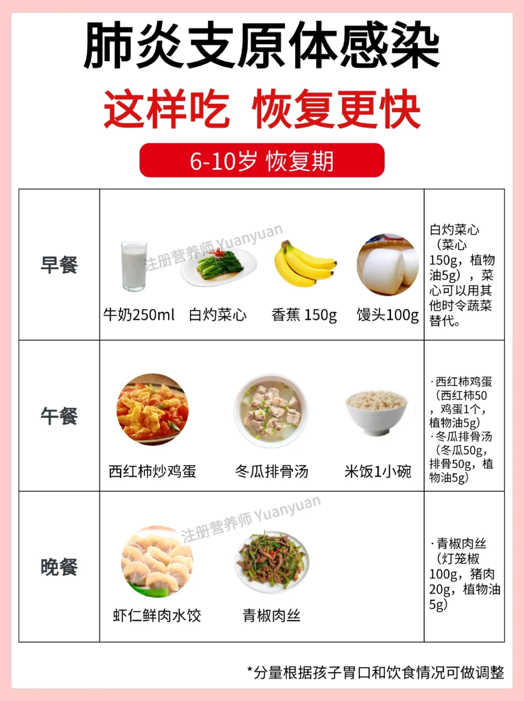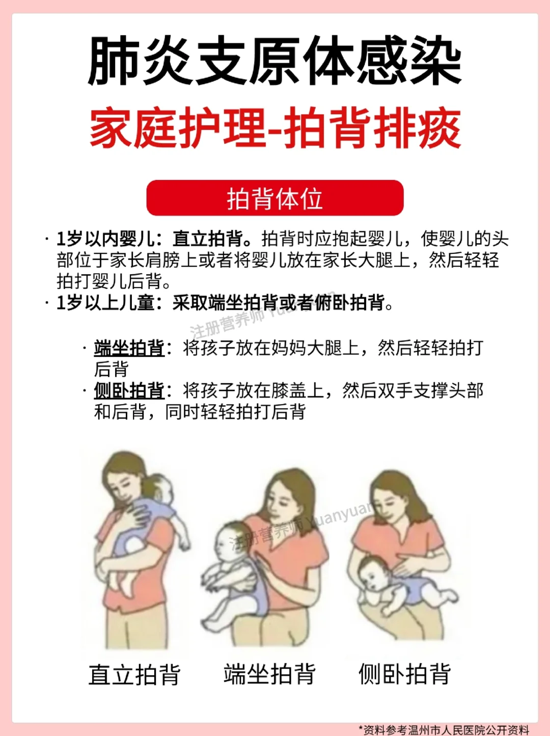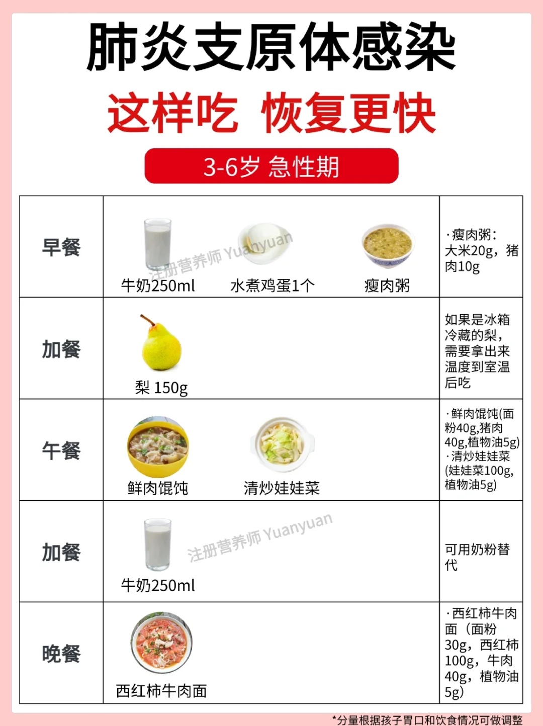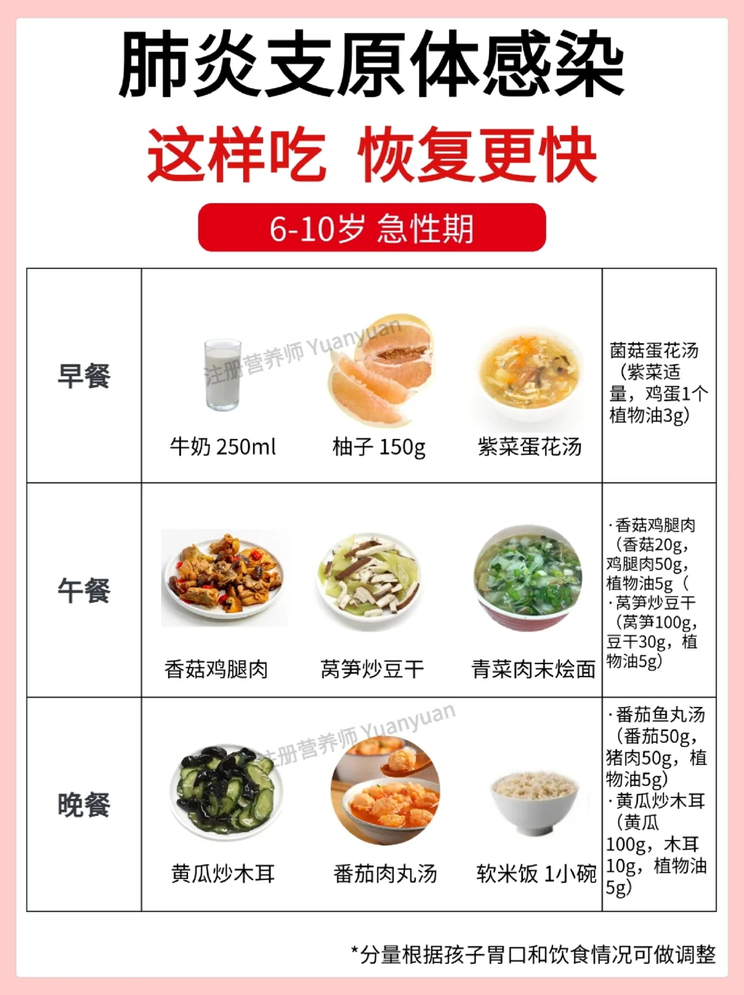支原体肺炎和流感来势汹汹,我们小区也有不少小朋友中招了。 支原体感染撞上流感季,真的是宝爸宝妈们的大劫难。 上次分享的支原体肺炎食谱大家说很有用,这次把食谱具体的注意事项和娃中招后的家庭护理也整理出来了,供参考。 *护理事项资料的来源声明:非原创,内容参考来源均在图上标注。 ⭐娃支原体中招饮食原则(急性期和恢复期都适用) ✅补充充足的蛋白质 3-6岁优质蛋白食物摄入50-75g/d,6-10岁优质蛋白食物摄入80g/d。 高蛋白质的食物有瘦肉、鸡蛋、大豆制品和乳制品等。 ✅保证充足的水分 3-6岁600-800毫升/天,6-10岁800-1000毫升/天,发热情况下可酌情加量。 ✅饮食要清淡 避免高糖/盐/油食物,不吃生冷食物,少食多餐,可选择瘦肉粥、面条、馒头、馄饨等。 ✅多吃富含维生素C和维生素A的食物 ✅合理补充微量营养素 准医嘱适量补充维生素A、维生素C、维生素D和锌 ⭐支原体中招后的居家护理 详细内容见上图 ⭐日常如何预防 -勤洗手,去过公共场所回家后认真洗手、洗脸,注意手卫生; -多开窗户通风,保持室内空气洁净; -避免去人群密集、通风不良的公共场所; -打喷嚏时用衣袖或肘部遮挡,而不是用手直接遮挡; -平日里清淡饮食,营养均衡,多喝温水,不吃煎炸、肥腻、冰冻等食物。