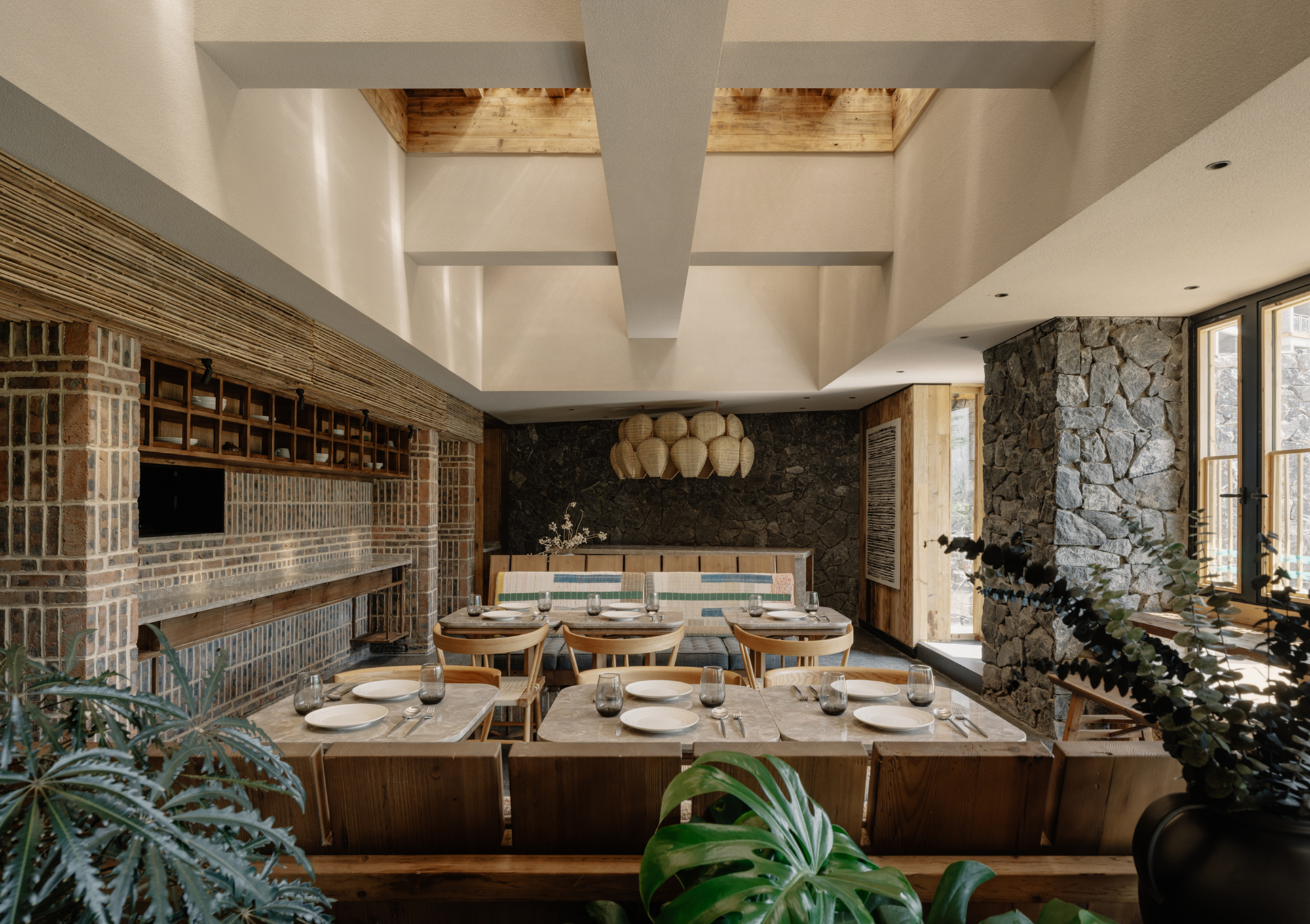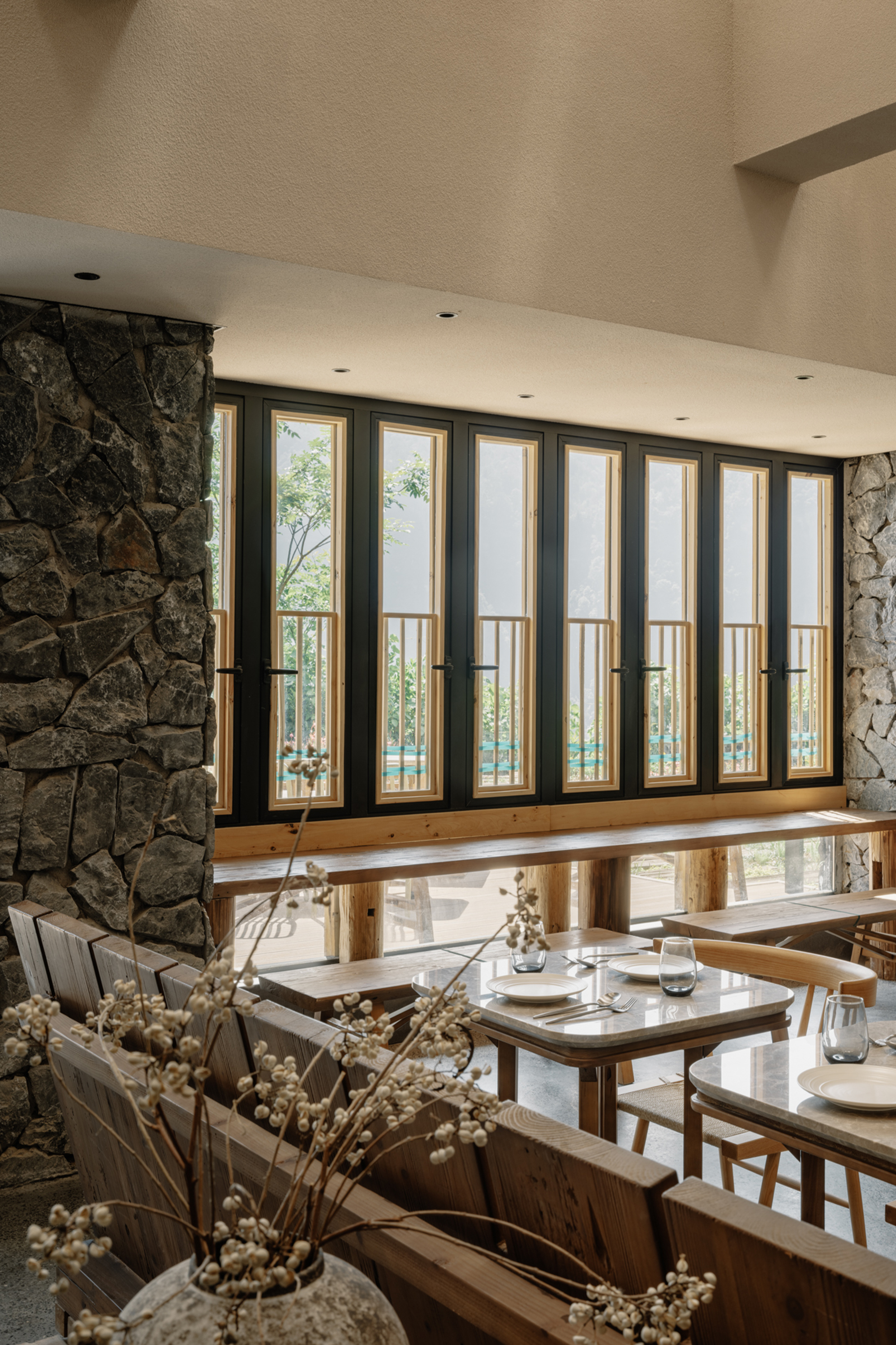 餐厅位于整体建筑的1层裙楼,通过建筑本身停车场区域向山中方向的外扩形成。由内向外向山中方向逐级布置厨房、室内餐厅区域以及外摆区,连接本身主体4层建筑以及室外外摆区和1层房间的庭院入口。