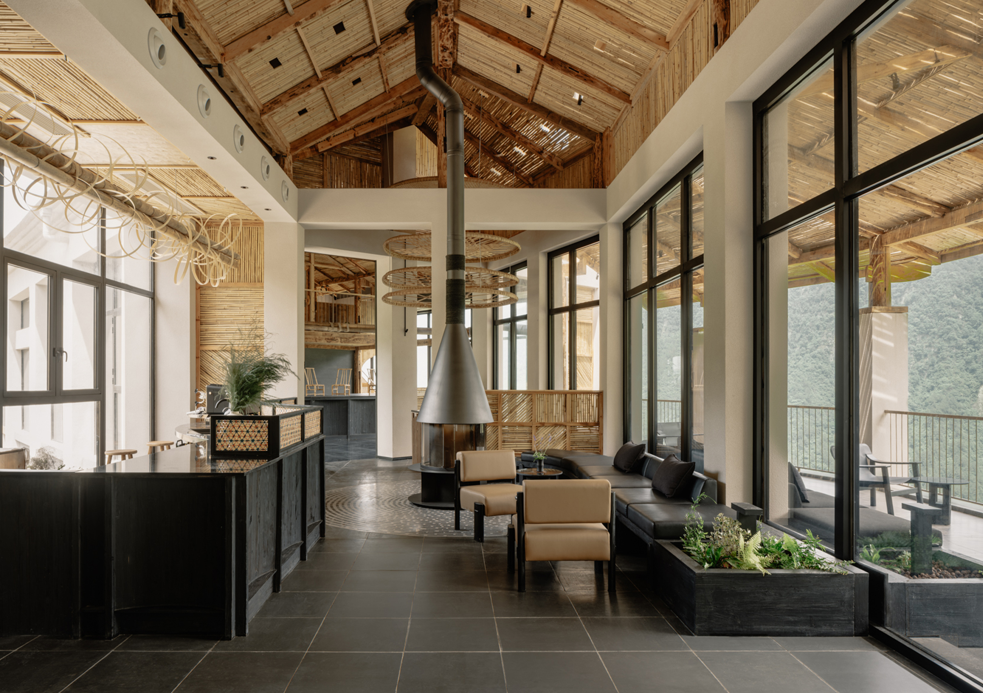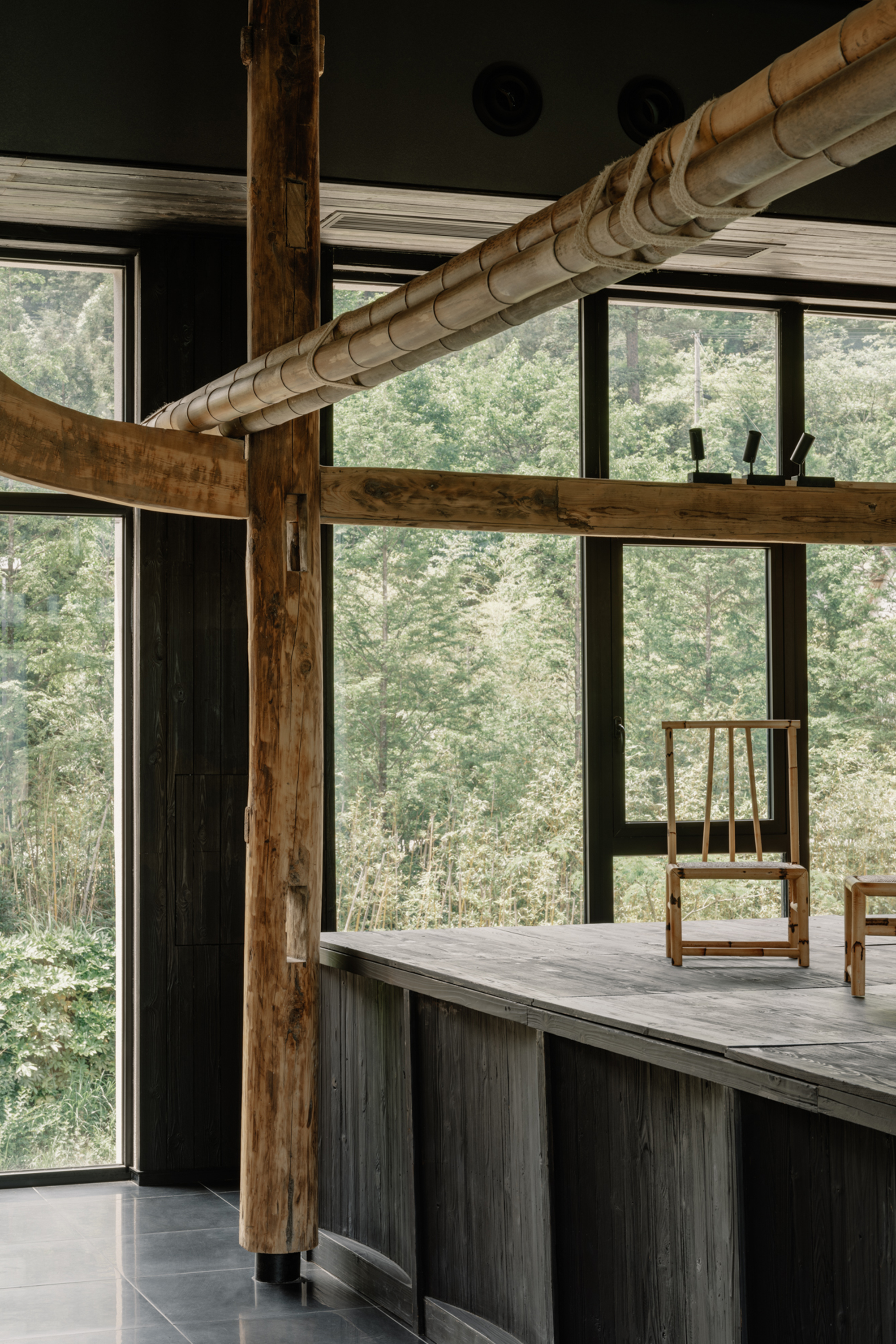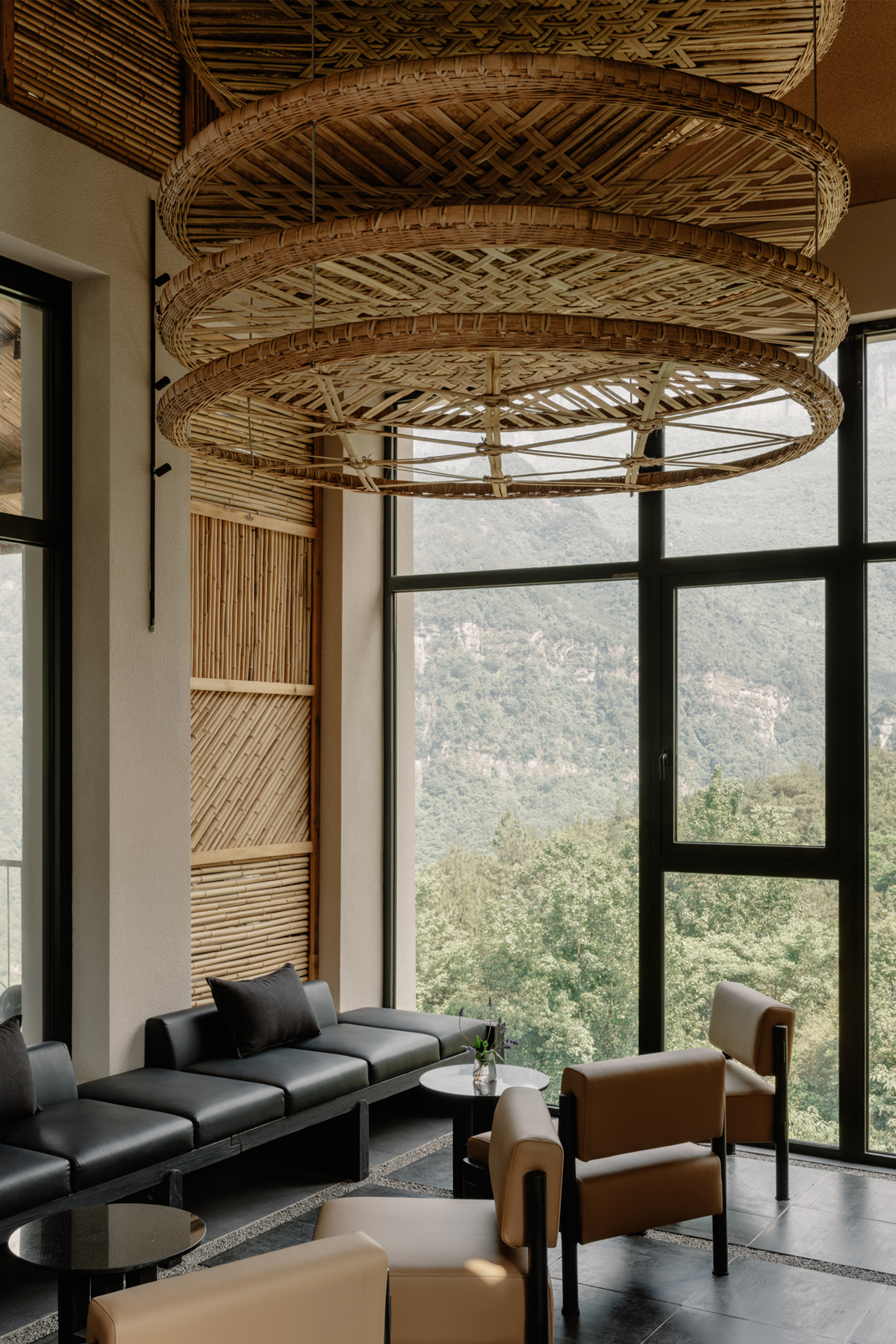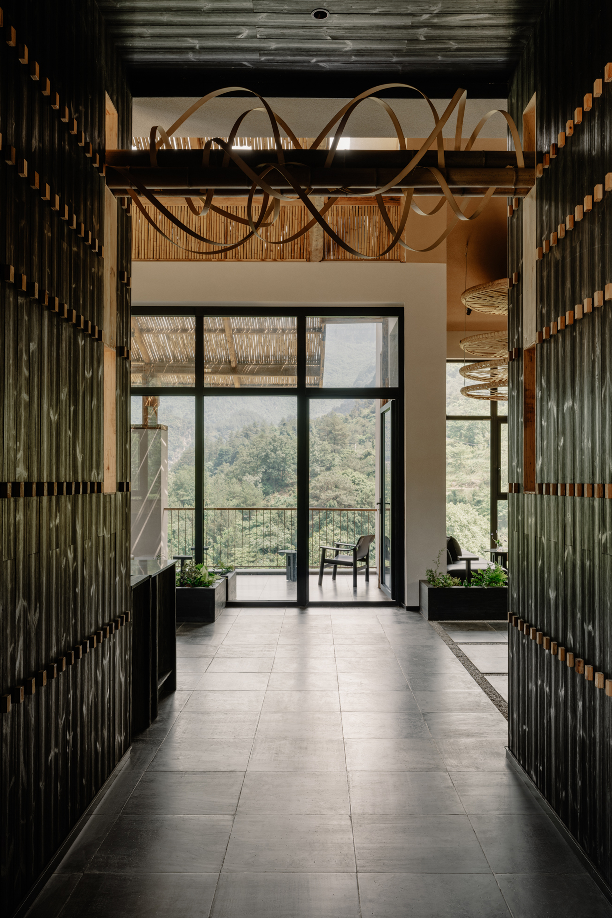 进入接待大堂后,营造出被山中物包裹的整体连续感。在延续当地建筑框架和填充的构造逻辑基础上,将山中的竹笋壳,方竹,回收的山中废弃屋物料,部分转化后的碳化木,竹编艺术品和山中特殊黑色石头揉合在一起,把自其,有机,逐级的展开给进入空间的客人。