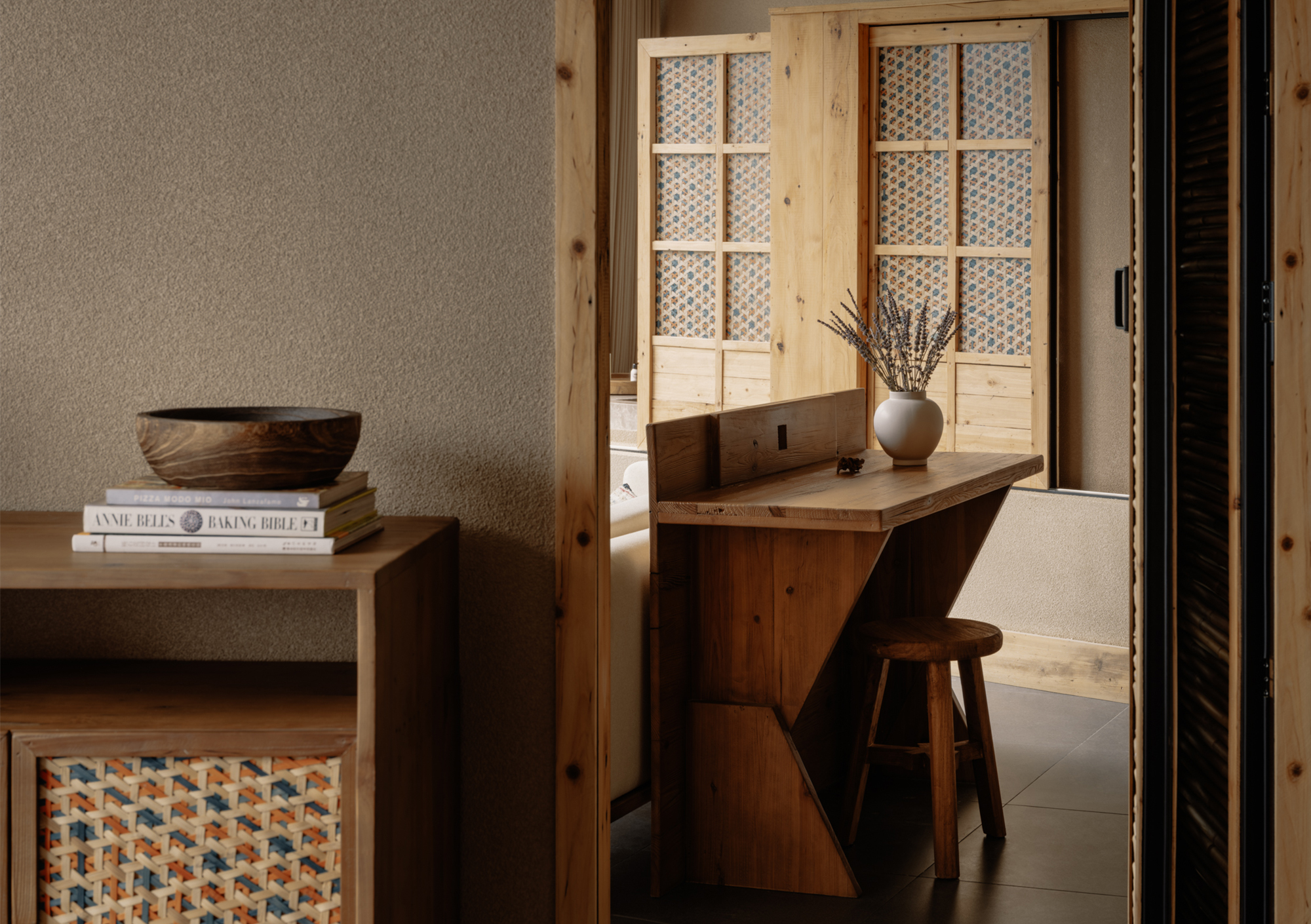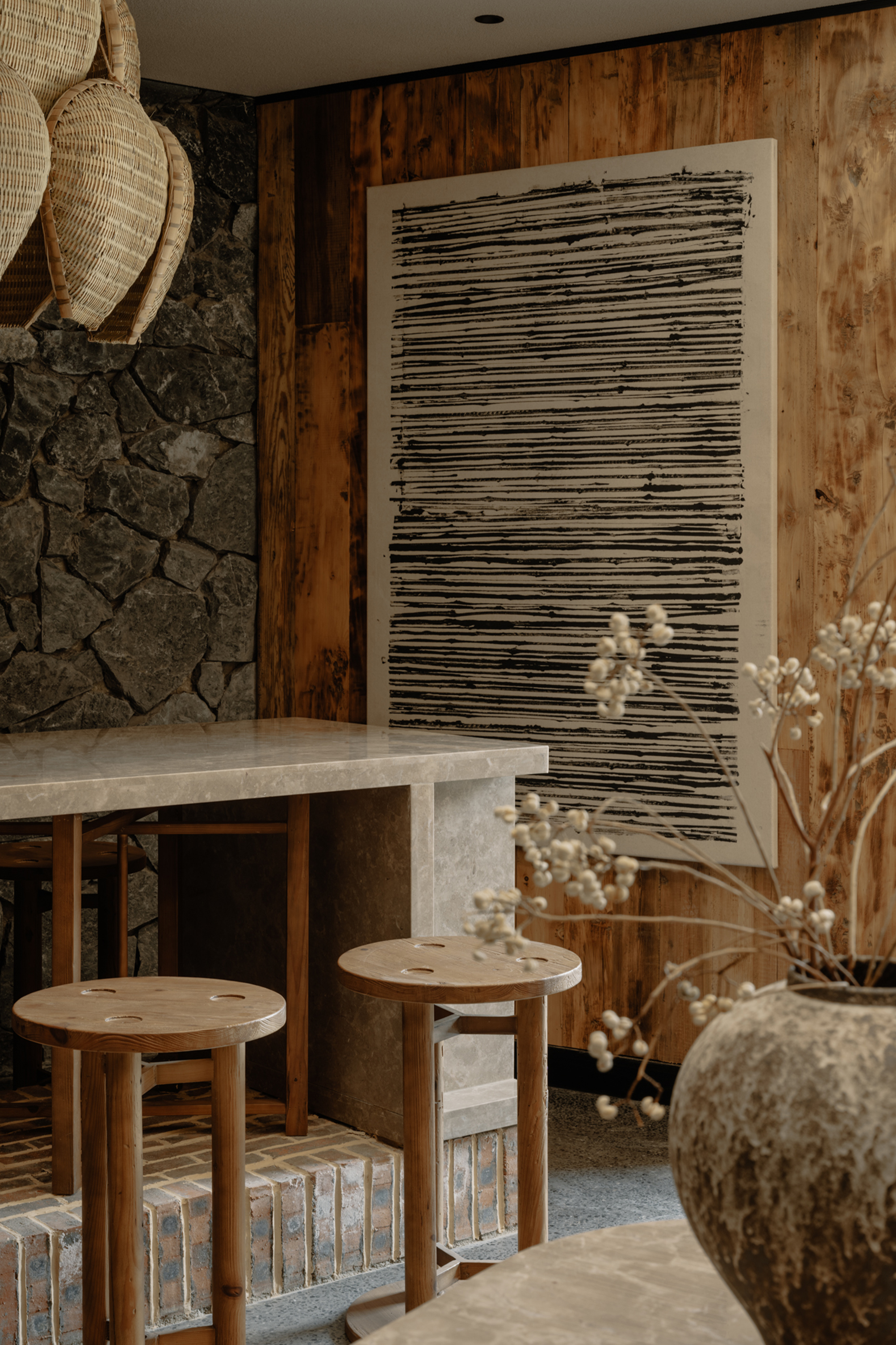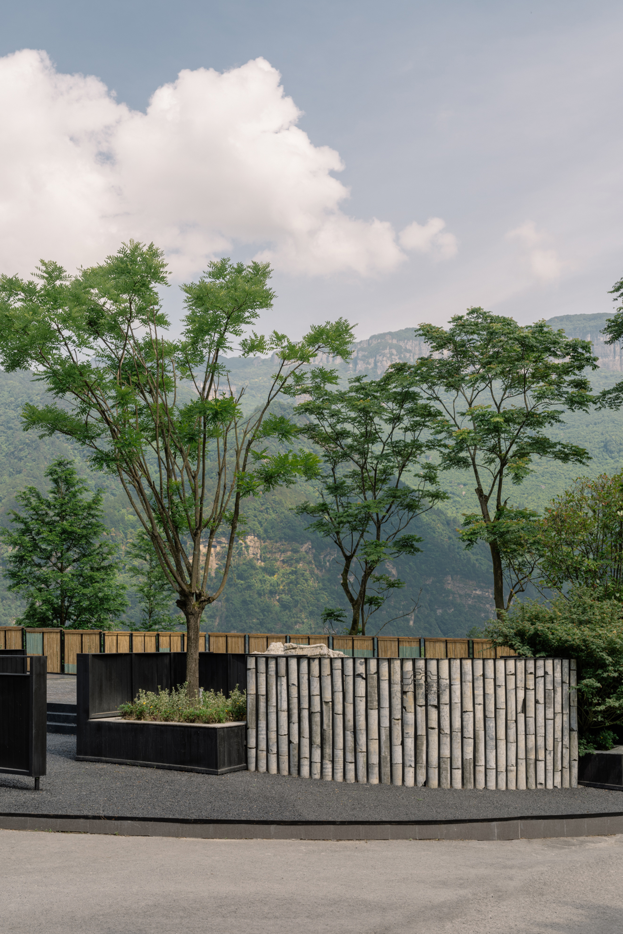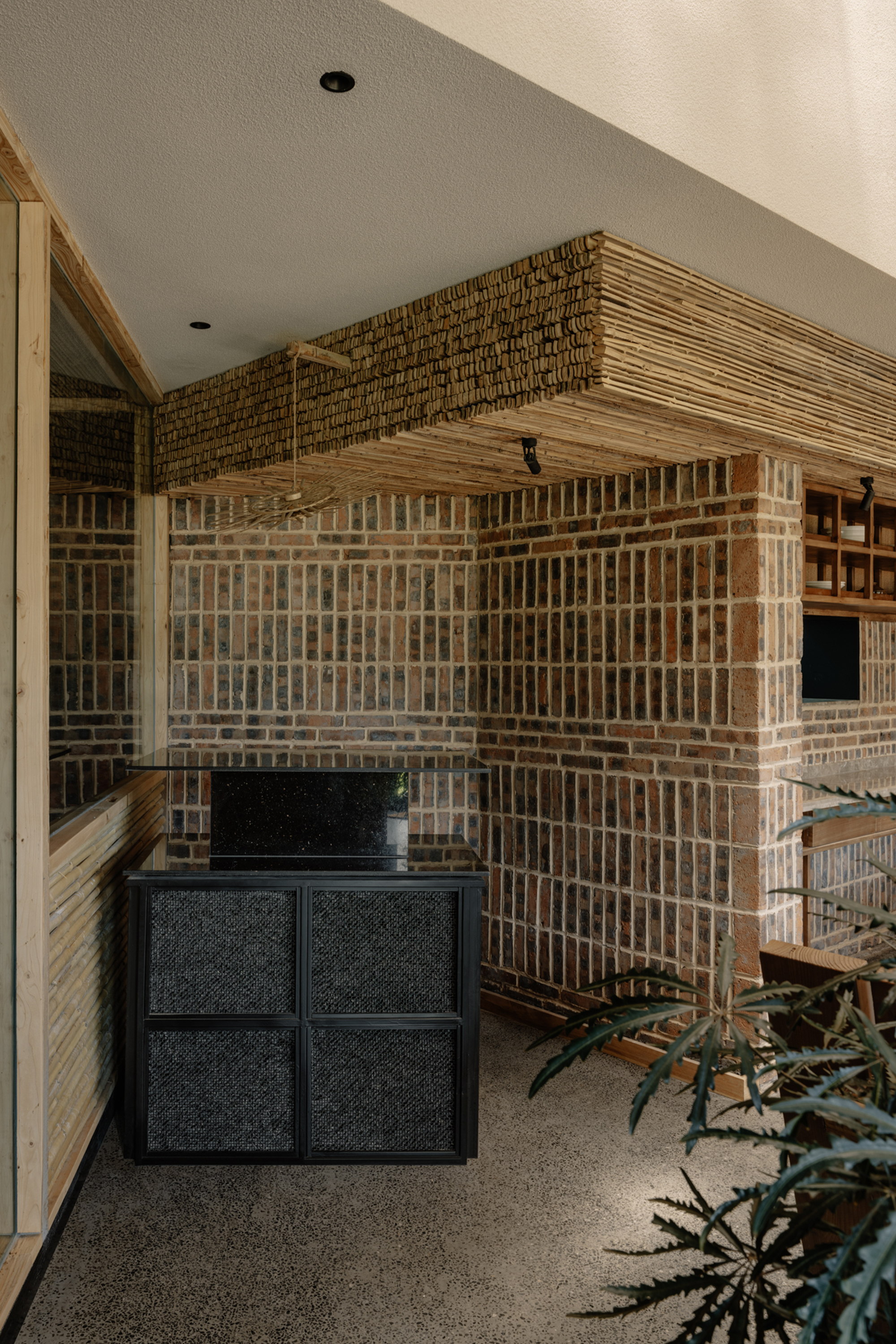进入接待大堂后,营造出被山中物包裹的整体连续感。在延续当地建筑框架和填充的构造逻辑基础上,将山中的竹笋壳,方竹,回收的山中废弃屋物料,部分转化后的碳化木,竹编艺术品和山中特殊黑色石头揉合在一起,把自其,有机,逐级的展开给进入空间的客人。