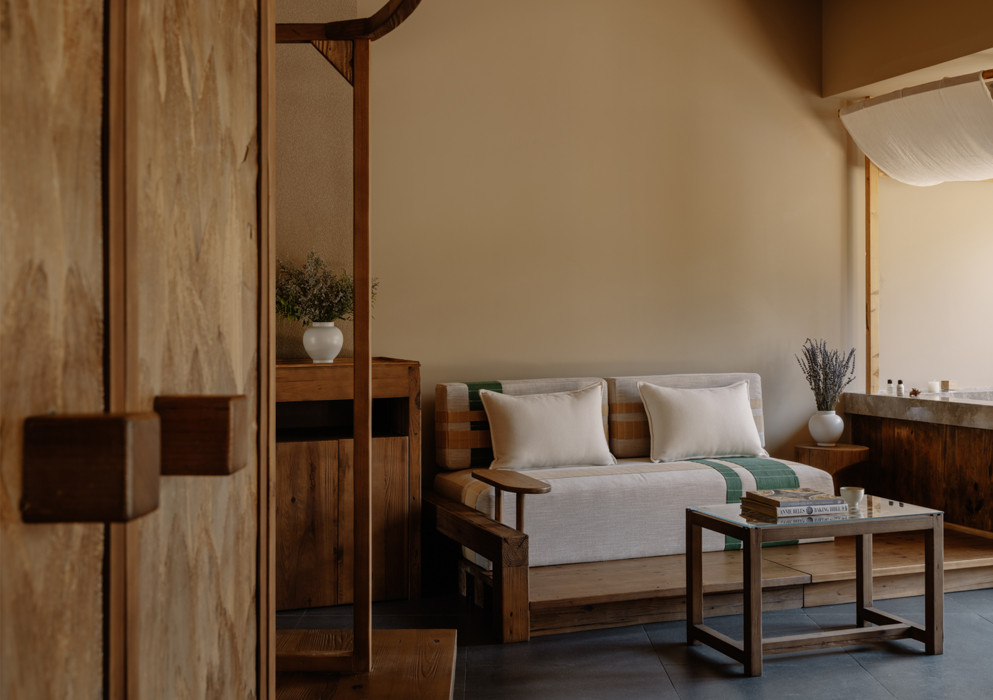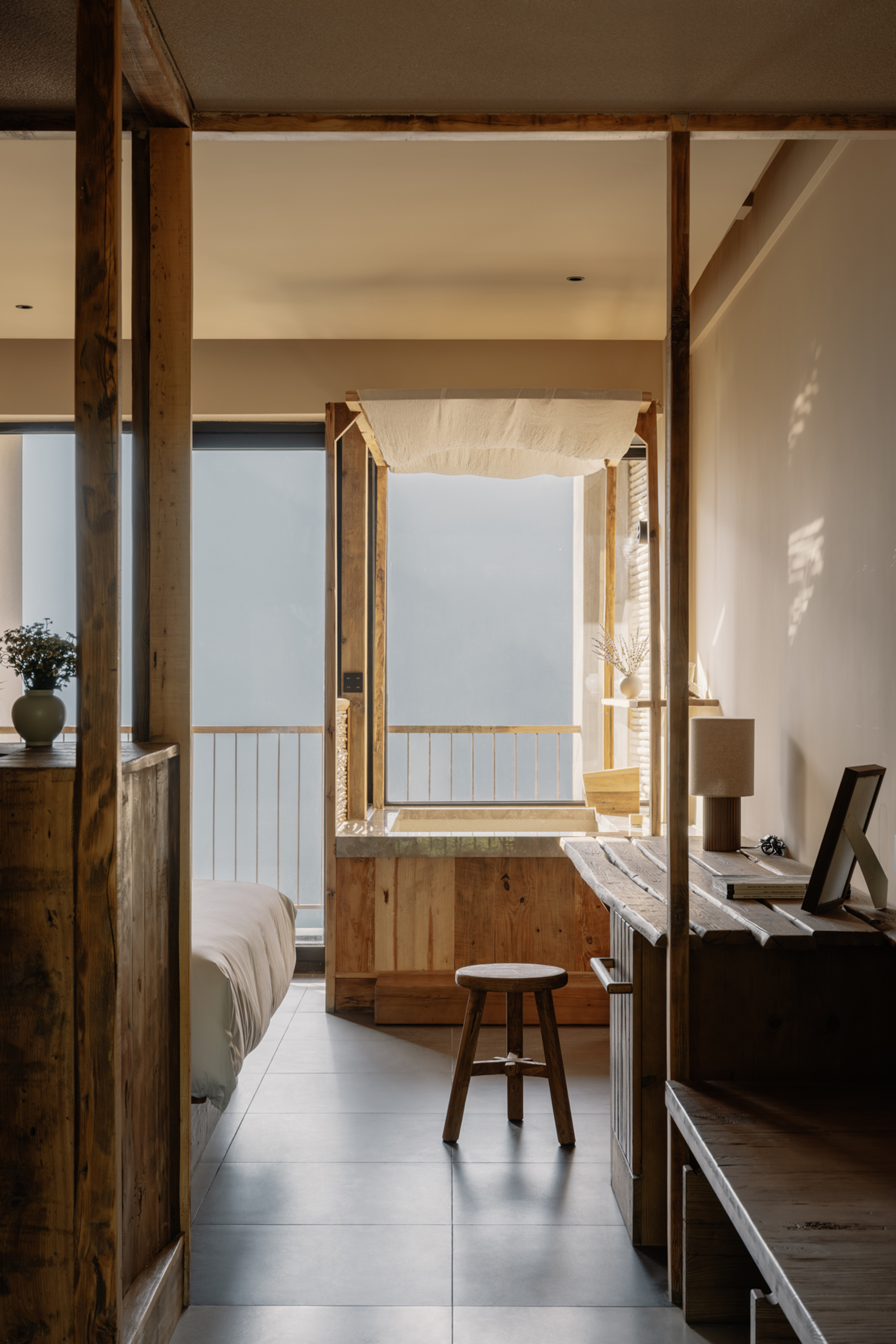 房间面向山体,分布在建筑中间楼层扇形布置打开。通过大小庭院房、高楼层套间、双床以及标准大床房满足立体式,多层次的运营客户需求。房间延续了建筑,公区整体的设计逻辑,用泥土的颜色串联起框架,材质,细节与艺术点缀。