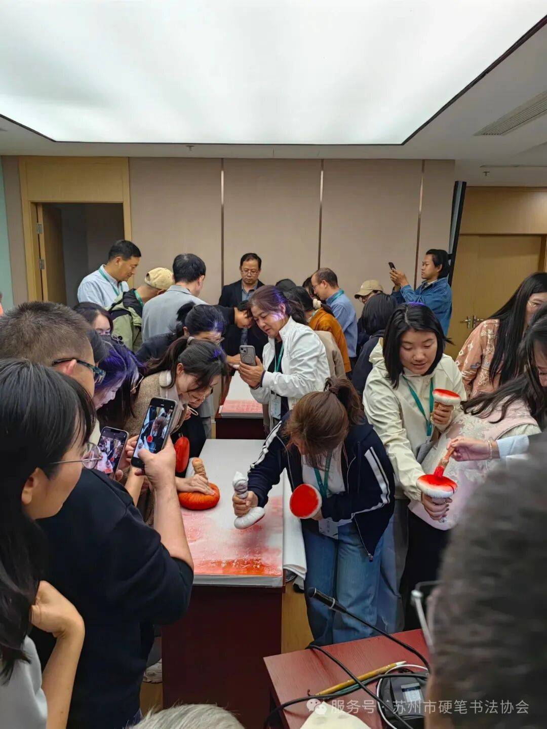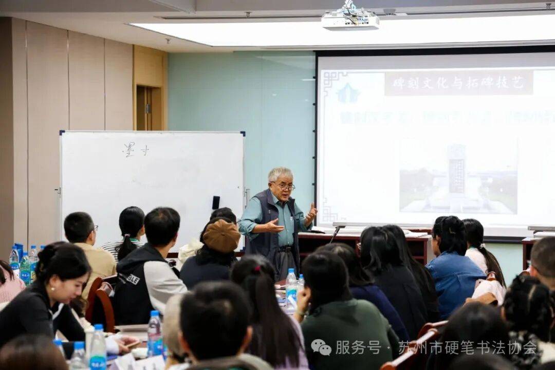 下午,主题为《镌刻汉字美、镌刻书法美、镌刻绘画美——碑刻文化与拓碑技艺》的课程受到了广大会员的热烈欢迎。该课主讲人为苏州市第五批非物质文化遗产代表性“碑刻技艺”传承人戈春暖,他以传统刻碑、拓碑的历史和技艺为切入点,深入浅出为广大学员讲解并演示了刻碑和拓碑工艺,并通过一系列实例让学员们领略到传统工艺的深远和伟大。学员们在戈老师的指导下,纷纷拿起拓包,亲身体验和学习拓碑技艺,整个课堂沉浸在欢声笑语的氛围之中。