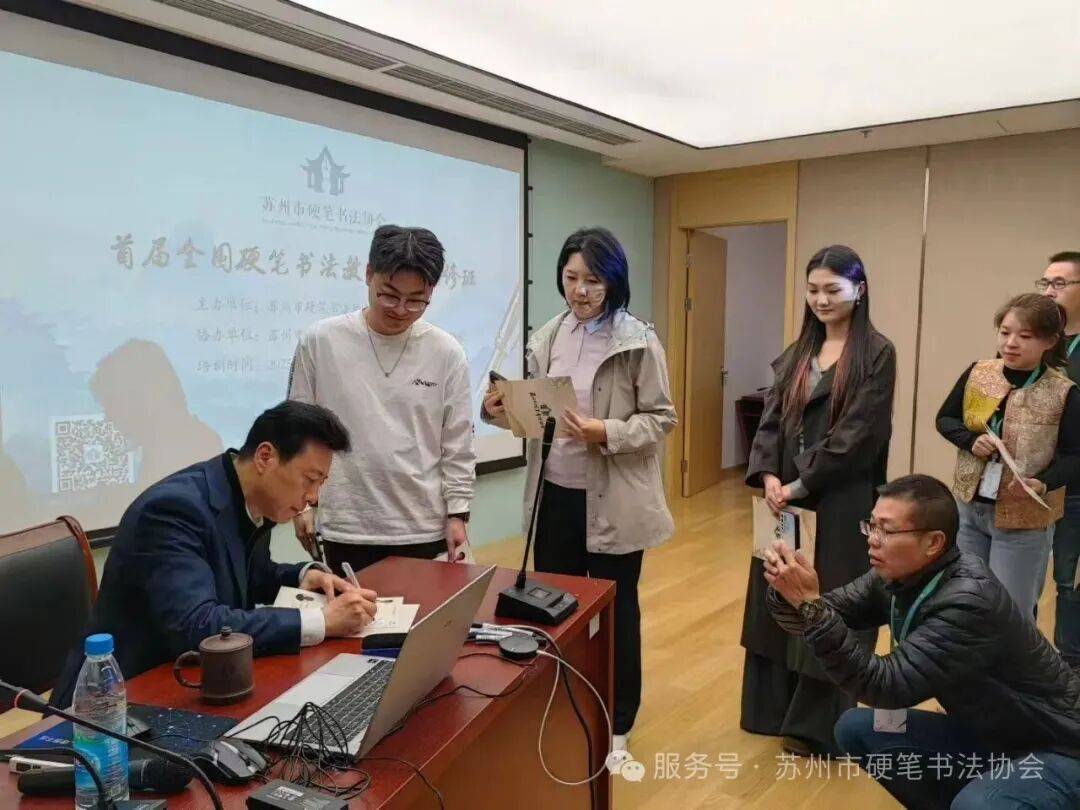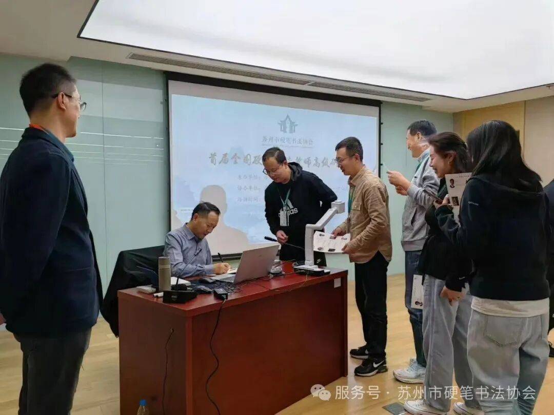 所有课程完成后,高研班组织学员们现场撰写学习心得并临创了一件硬笔书法作品,作为此次培训的结业考核,大家伏案捉管、奋笔疾书,现场气氛热烈、热情洋溢。最后,高研班顺利举行结业仪式,全体学员通过考核并获得结业证书。经协会学术委员会和规范字委员会老师们的审核评定,最终有31件硬笔书法作品被评为“优秀创作奖”,19位学员被评为“优秀学员”并将吸收成为苏州市硬笔书法协会会员。