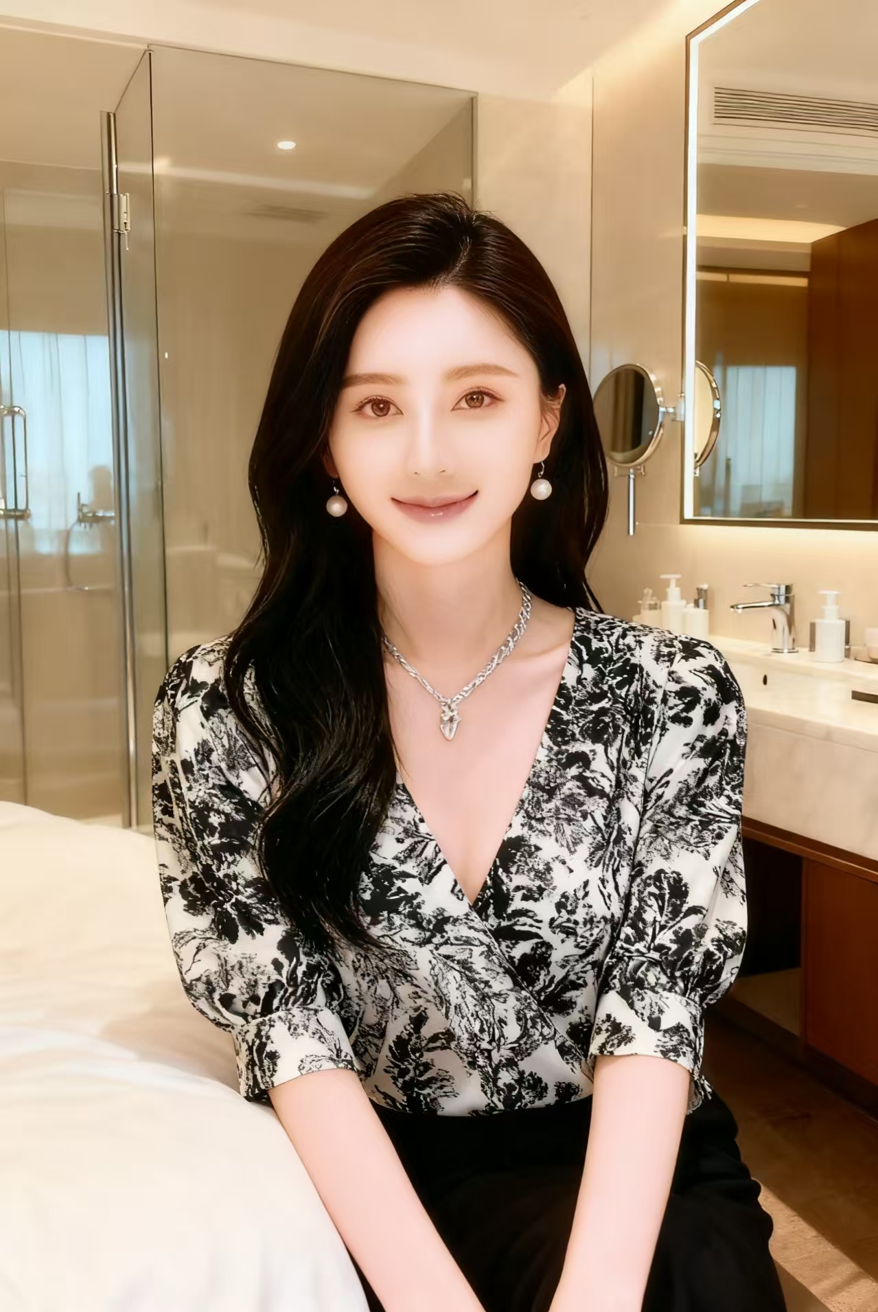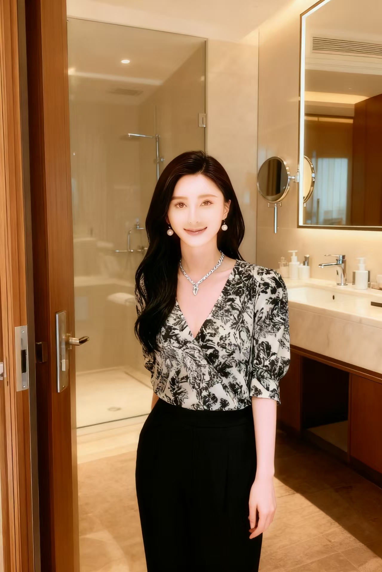 黑白花卉图案的V领中袖上衣,衣料质感飘逸,花卉印花富有艺术感,V领设计增添了几分优雅气质。下装搭配黑色高腰长裤,简约利落。配饰方面,佩戴了珍珠耳环和一条带有吊坠的银色项链,精致的饰品为整体造型提升了质感,整体穿搭呈现出优雅知性的风格。