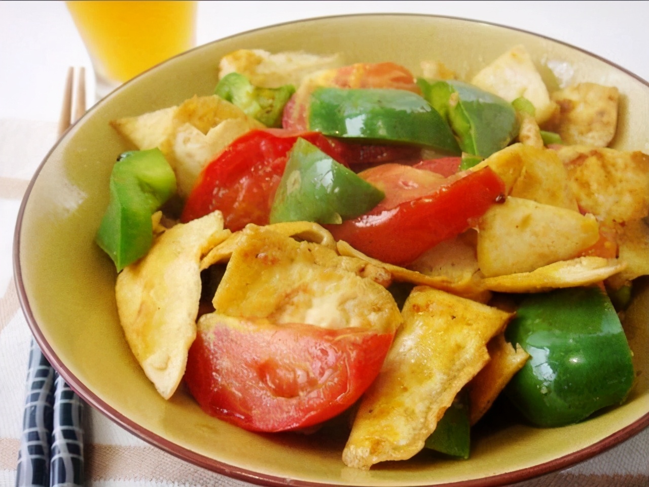 2、起锅热油,爆香姜丝,放入白豆腐干,煎至两面金黄色,再放入绿菜椒,加少许清水翻炒,最后放入西红柿,加盐、蘑菇精调味,即可出锅。