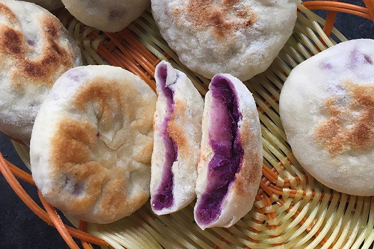 4. 分成大小适中的小面团,取其中一个,擀制成圆形面皮,在面皮中央放入紫薯泥馅。包裹住,封口,再用手轻压成饼。