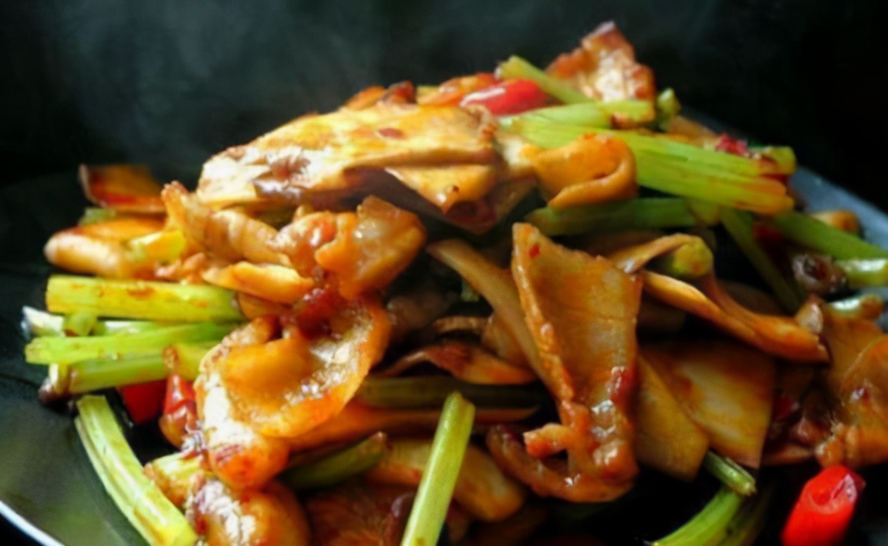 食材: 杏鲍菇250克、五花肉70克、芹菜100克、生姜2片、大蒜2瓣、小米椒2个、郫县豆瓣酱1大勺、生抽2小勺、糖1小勺;