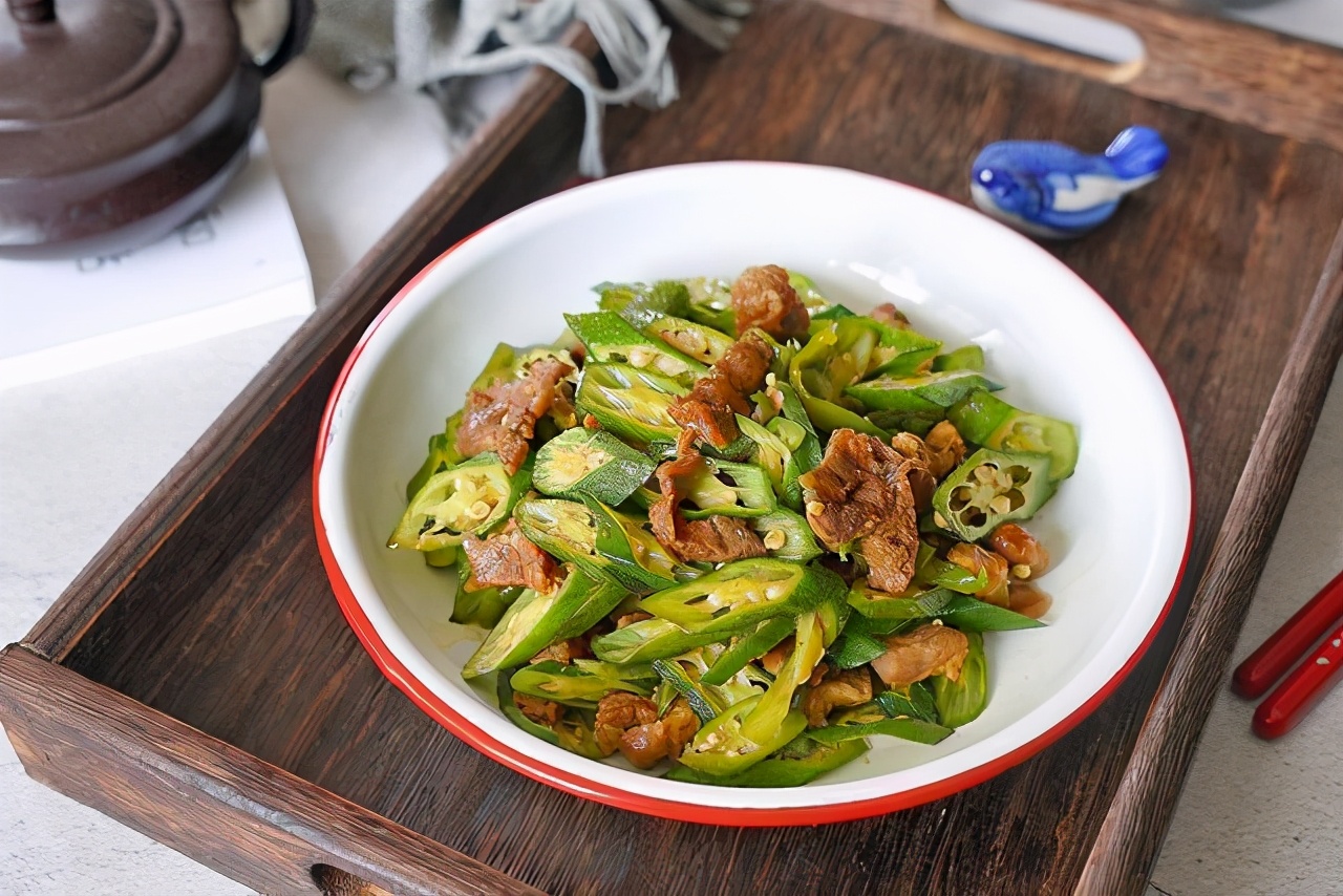 材料:梅花肉100克、秋葵200克、尖椒2个、生姜丝少许、盐适量、生抽2茶匙、老抽数滴、淀粉少许、白糖少许