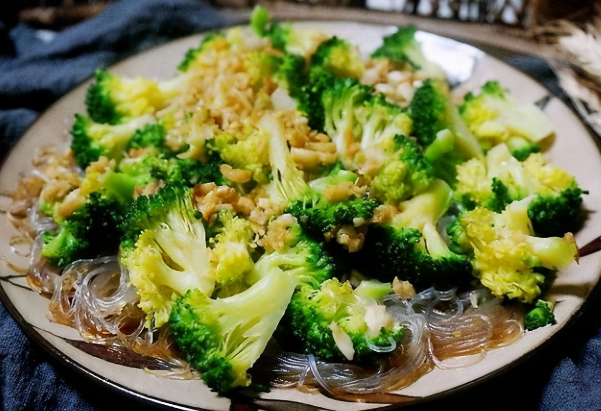 所需食材:西兰花,粉丝,蒜末,蒸鱼豉油,食用油