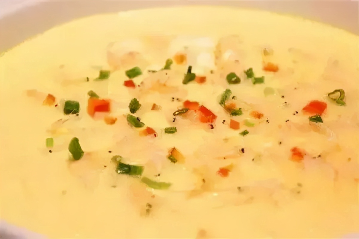 材料:虾仁50克、米饭200克、山药泥30克、金瓜泥10克、年糕30克、菜心10克。盐2克、鸡粉5克、胡椒粉2克、鸡油5克、浓鸡汤300克。