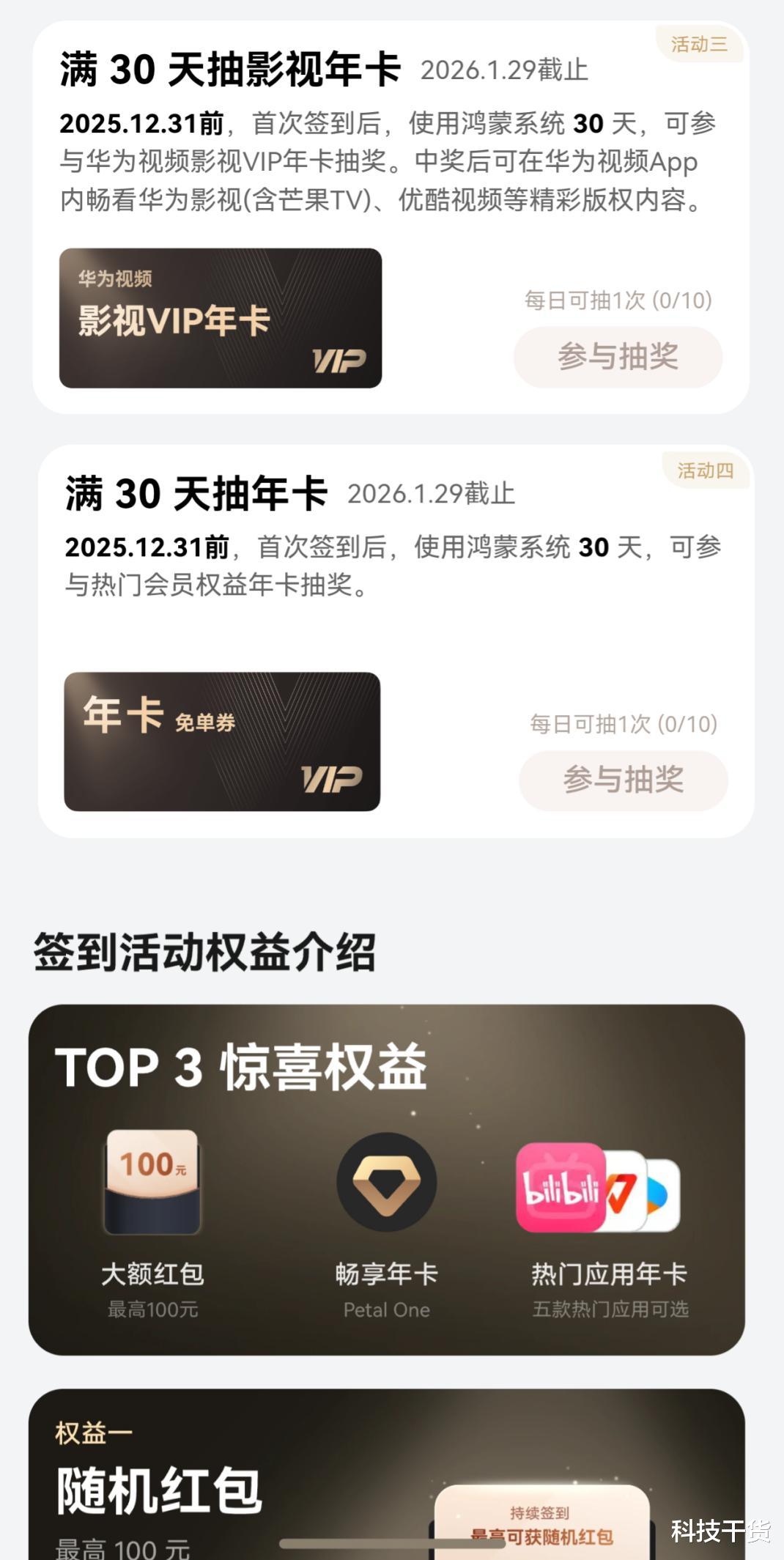 其实我的“鸿蒙有礼”在10月初就圆满毕业了,不但领到华为视频、华为音乐、华为阅读、华为主题的7天会员,还有n张月卡免单券和年卡免单券,直接帮我把WPS会员续期到了2026年。本以为没我啥事了,升级鸿蒙6后点开一看,没想到还上新了满30天抽影视年卡和热门应用年卡的活动,年卡可以五选一兑换WPS、B站、芒果tv、优酷视频和喜马拉雅会员。即使像我这种早早“毕业”的用户也能参加,每天有1次抽奖机会,最多可以抽10次。