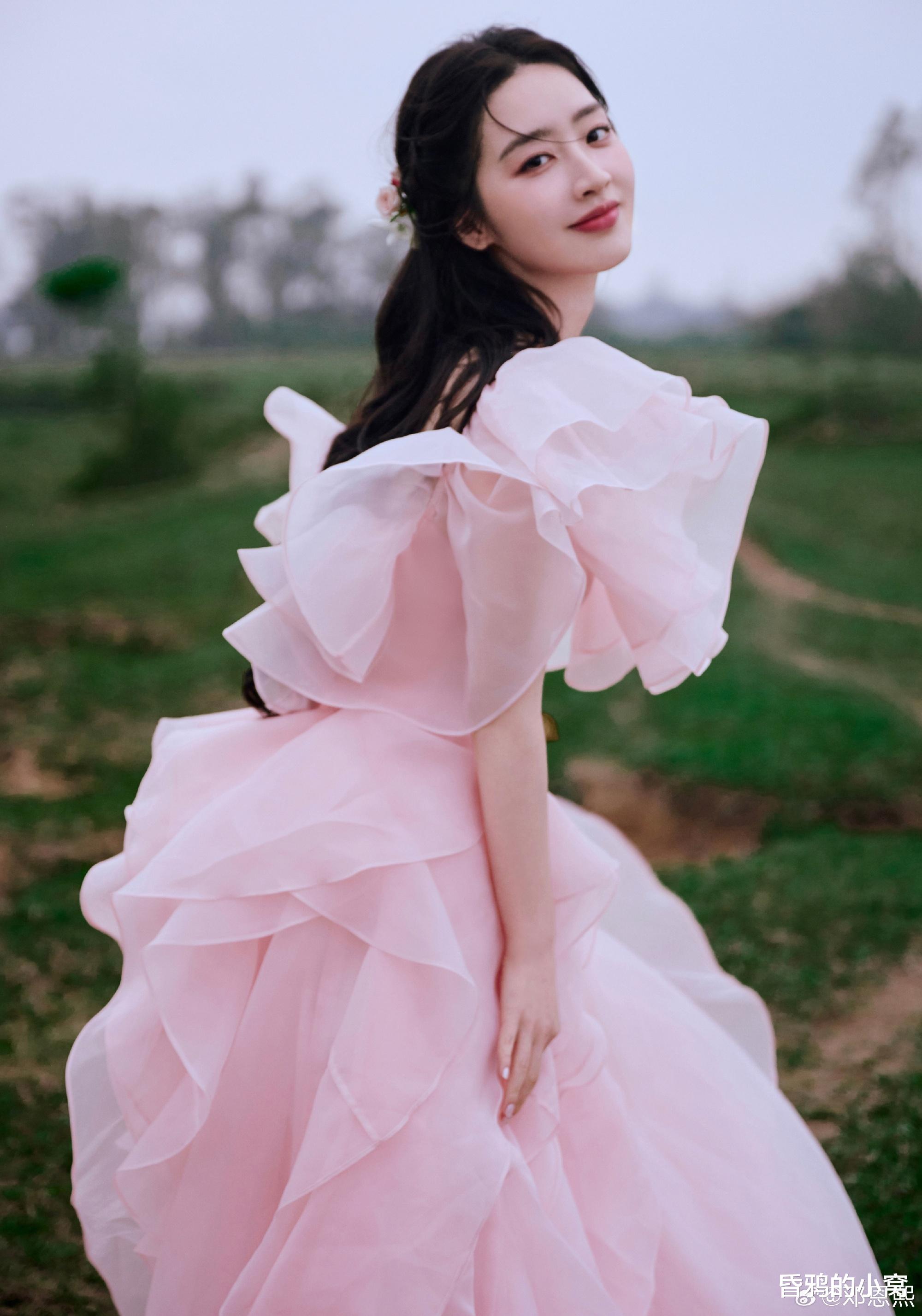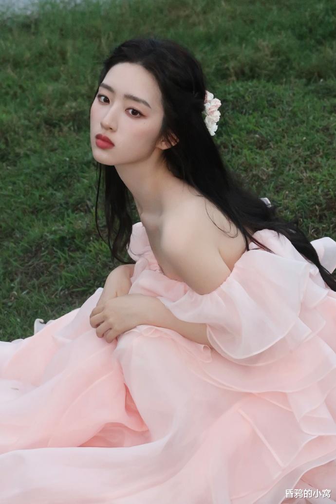 邓恩熙身穿藕粉色挂脖薄纱长裙,搭配低马尾发型,整体造型轻盈明媚,宛如“水蜜桃宝宝”“棉花糖少女”,完美诠释青春活力与鲜活。