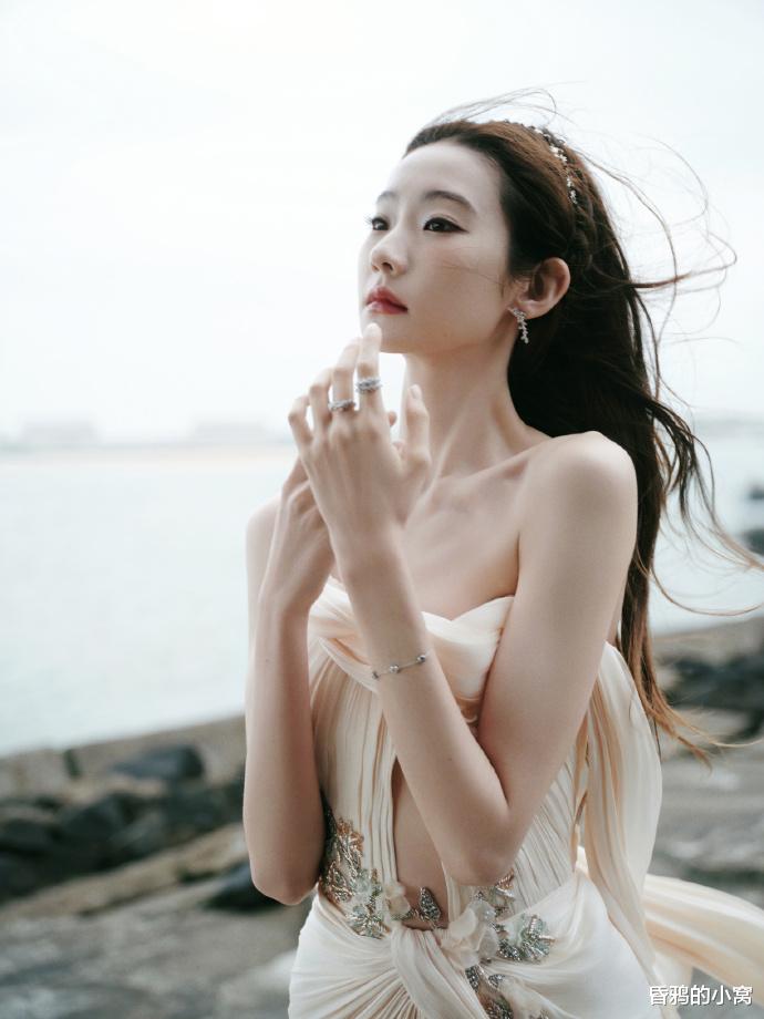 张艺凡身着轻薄纱质抹胸米白色长裙,搭配自然卷发与精致配饰,尽显“千金贵女”的优雅与少女的灵动,清新甜美的气质扑面而来。