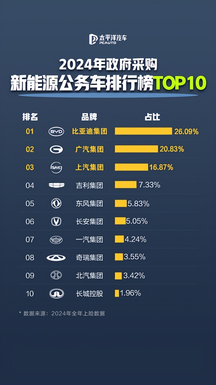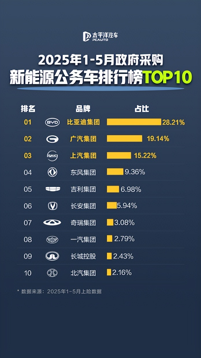 这一政策不仅是对本土品牌的战略支持,更是对中国汽车工业实力的公开背书。太平洋汽车发布的 2023-2025 年政府采购新能源公务车榜单显示,比亚迪以过硬的产品力和品牌力稳居冠军,政府采购的每 4 辆新能源车中就有 1 辆来自比亚迪,平均占比达 28.02%。这一成绩不仅源于政策引导,更是比亚迪在长期公务车对比测试中凭借性能、成本与可靠性胜出的结果。