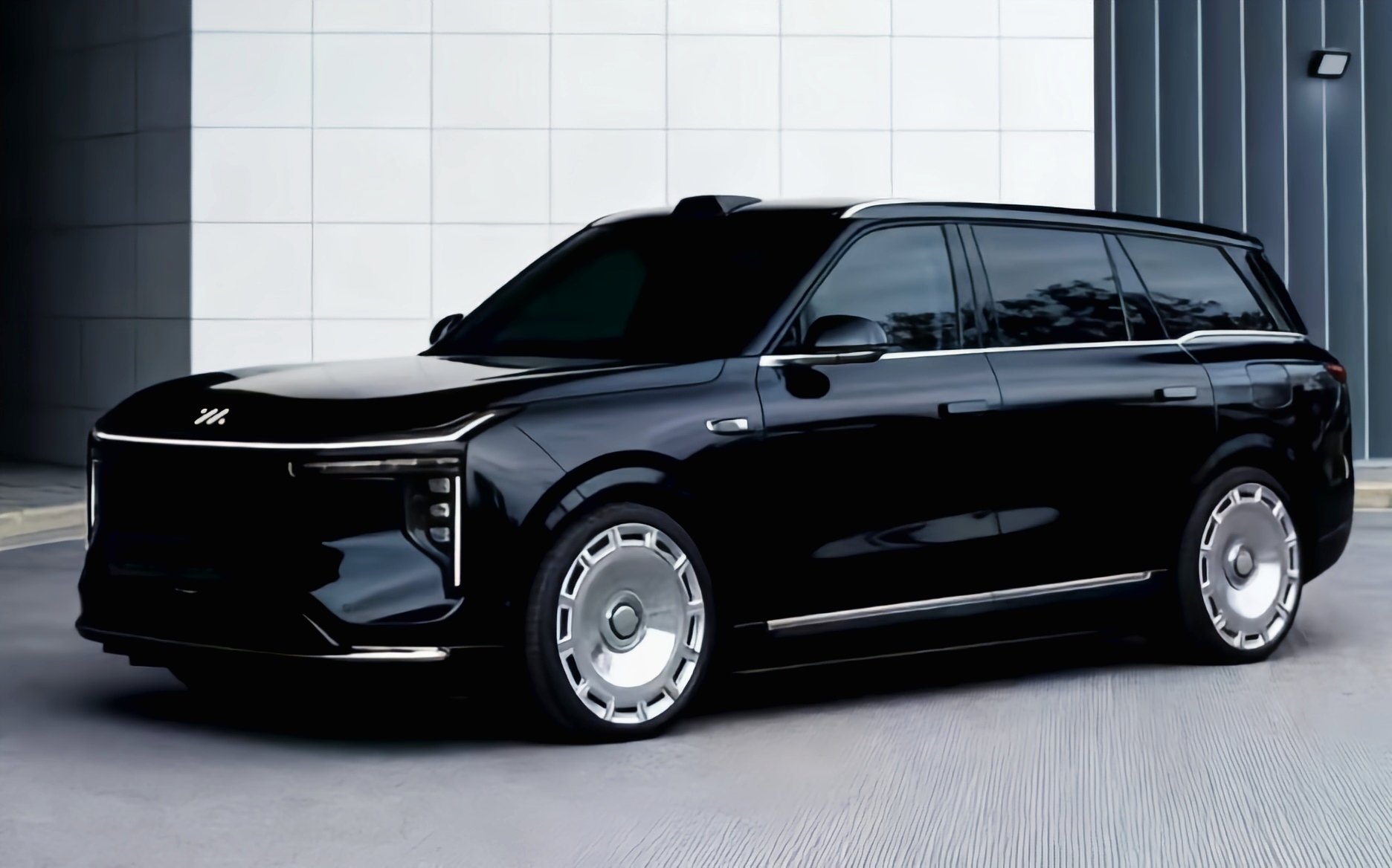 外观上,看着大气稳重 方方正正的,头灯设计挺特别 晚上亮起来辨识度高,前风挡还装了探射灯(夜间照明覆盖8000㎡)。封闭式前脸+星环贯穿灯带,悬浮车顶+隐藏门把手。可选22英寸“大饼轮毂”+布雷博卡钳。