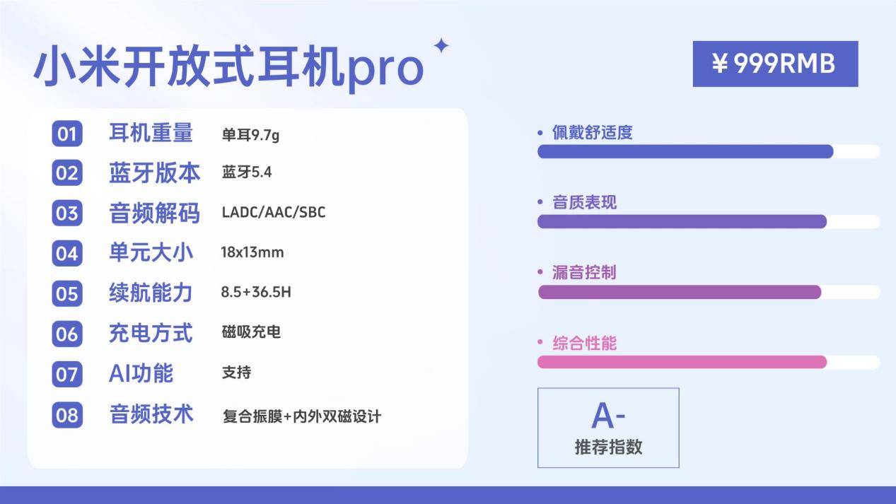 配置层面,耳机搭载蓝牙5.4芯片,实现低延迟、高稳定性的无线传输;总续航长达36.5小时,支持快充功能与多项智能交互操作。整体来看,小米Pro在音质、佩戴舒适度与功能实用性之间达成出色平衡,以超越同价位产品的综合表现,成为开放式耳机市场的高性价比优选。