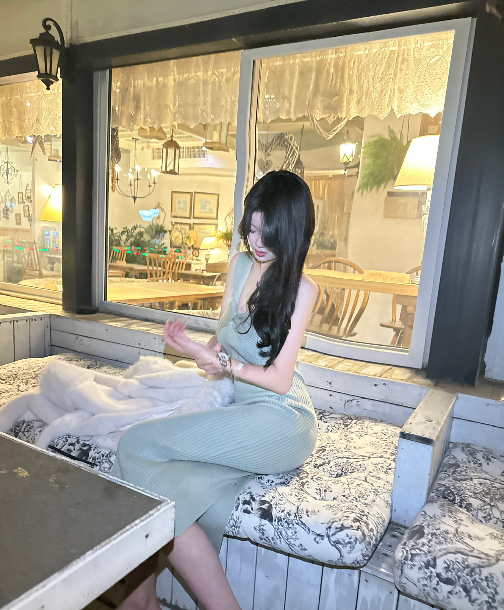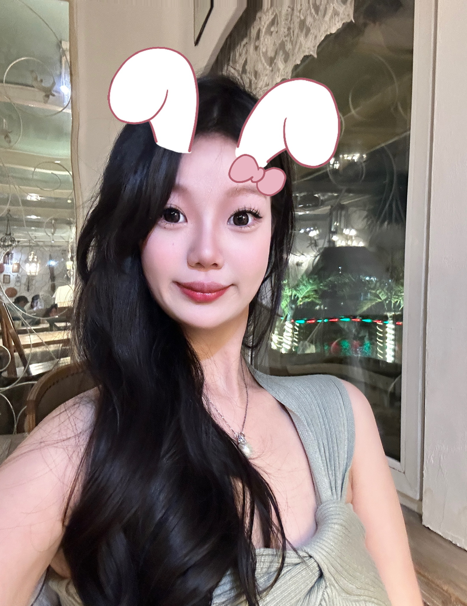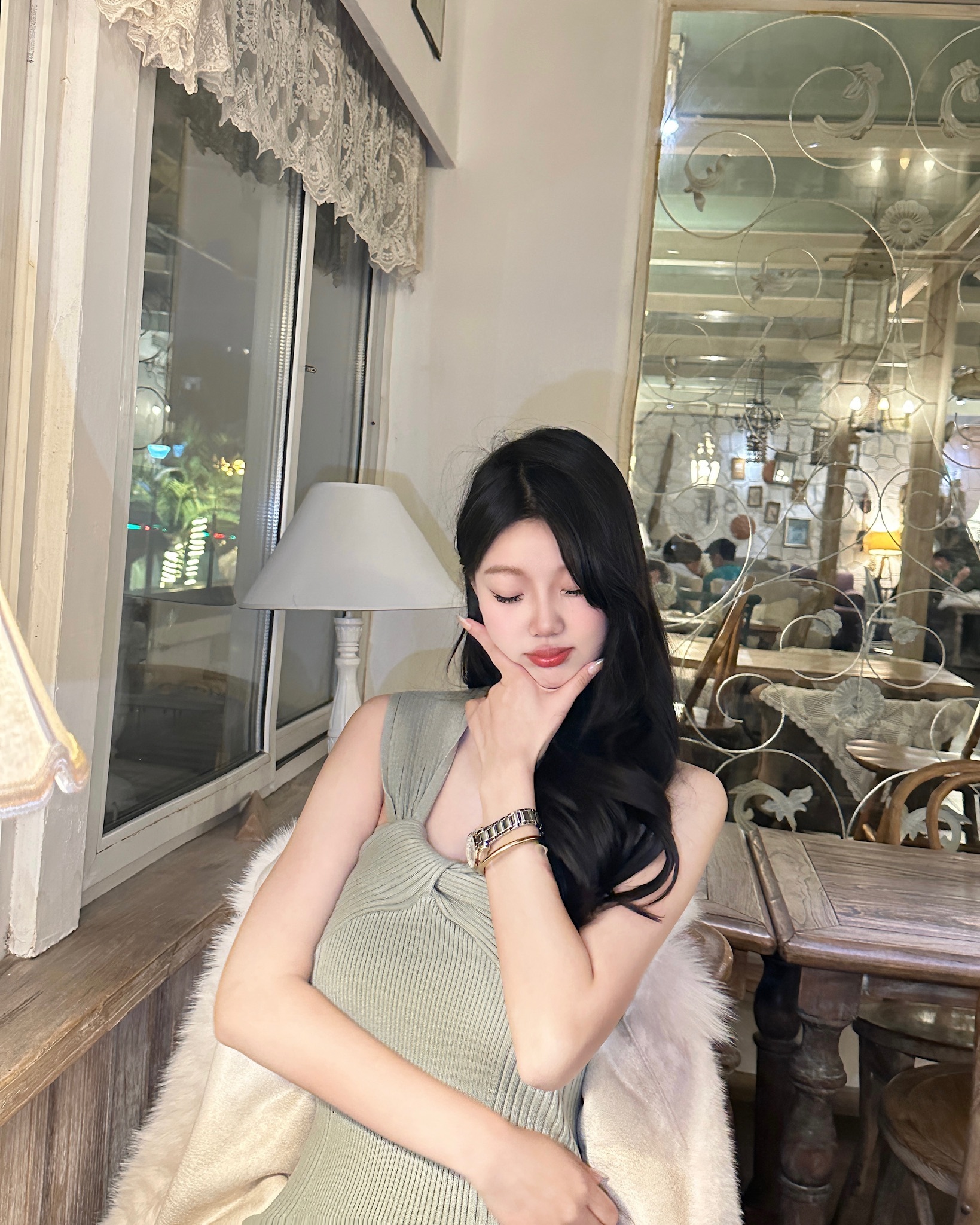 嫩绿色修身长裙再配上卷卷大波浪太美喽,又在脖子上搭配了小珍珠做点缀装饰,显得格外高级又不失可爱[污]