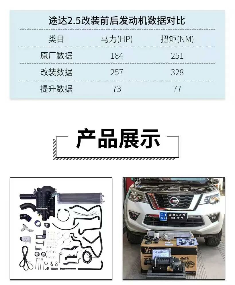 众多车主在为途达加装 VT 机械增压后,最直观的感受就是动力性能的大幅提升。经过专业设备测试,改装后的途达,马力可提升 73 匹,扭矩提升 77牛米,最终最大马力可达 257 匹,最大扭矩可达 328 牛米。这样的动力提升幅度,相当于为途达换了一颗更强大的 “心脏”。百公里加速成绩也得到了极大改善,可缩短 3.6 秒左右,轻松突破 9 秒大关。在实际驾驶中,高速超车变得轻而易举,只需轻点油门,车速便能迅速飙升,轻松超越前车。面对越野场地中的陡坡,车辆也能凭借强劲的低扭输出,稳稳地攀爬而上,再也不会出现动力不足导致的停滞不前。
