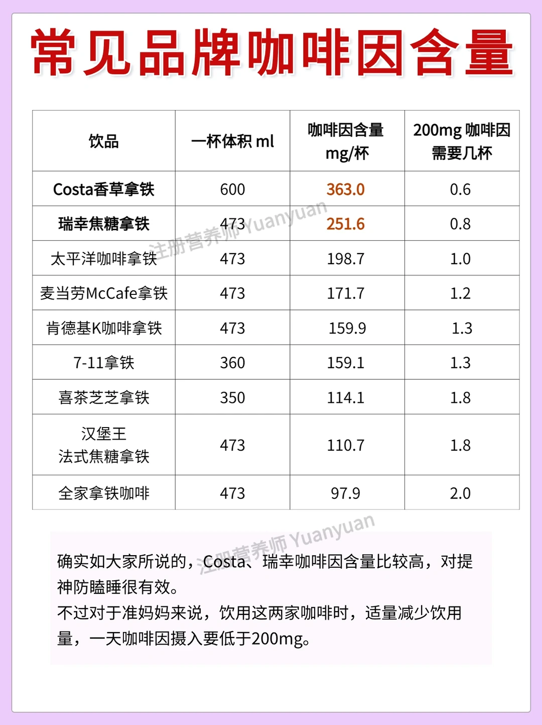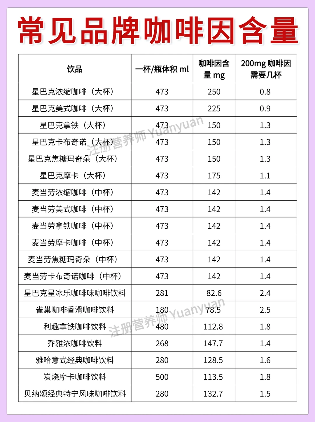 ✨整理了常见品牌咖啡咖啡因含量,包括瑞幸咖啡,麦当劳,汉堡王,喜茶,Costa,全家,星巴克。还有些茶的咖啡因信息,供参考。