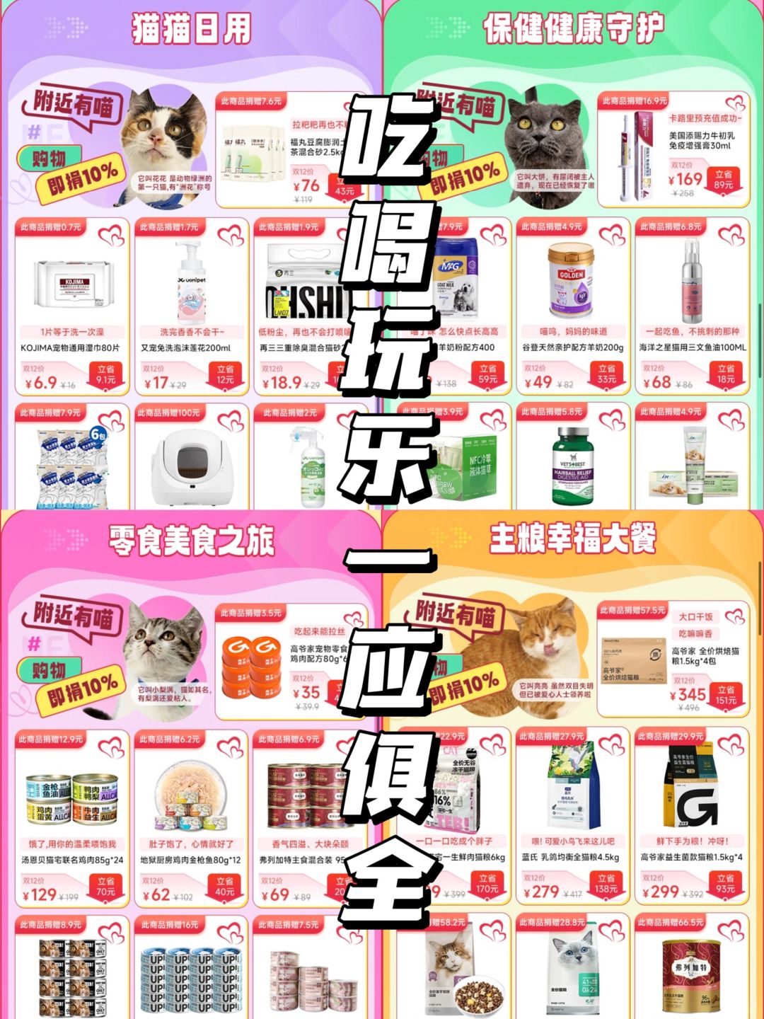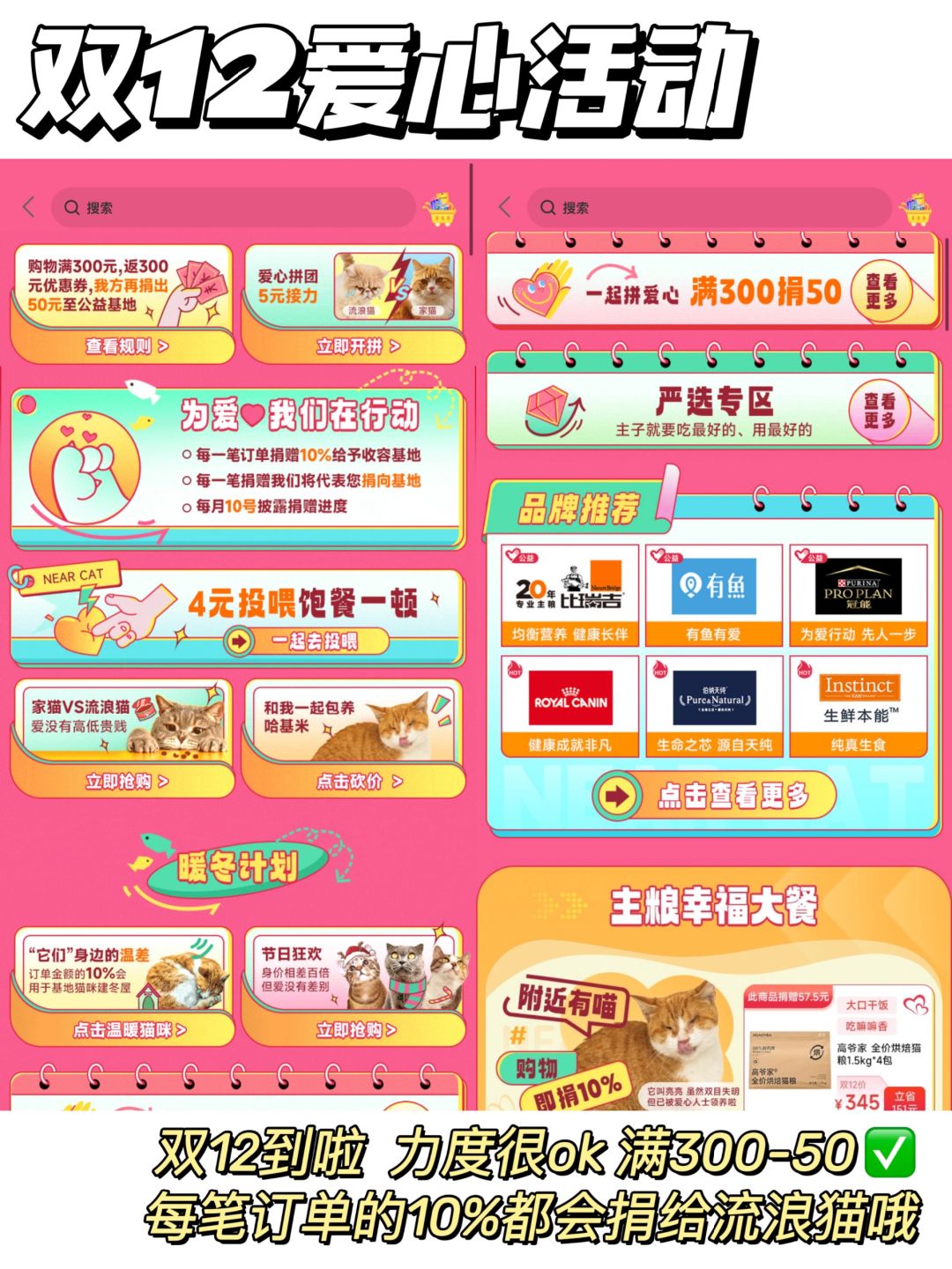 它最吸引我的地方就是买东西居然可以献爱心,购买的每笔订单都有10%用于流浪猫!也有单独投喂的板块,4块钱就可以让小猫咪饱餐一顿!这个月的双十二还有特别的爱心活动:满300就会捐出50给流浪动物📌,反正都是要给毛孩子买东西的,这上面不仅优惠,还能让流浪猫咪过的好一点,真的是一举两得。