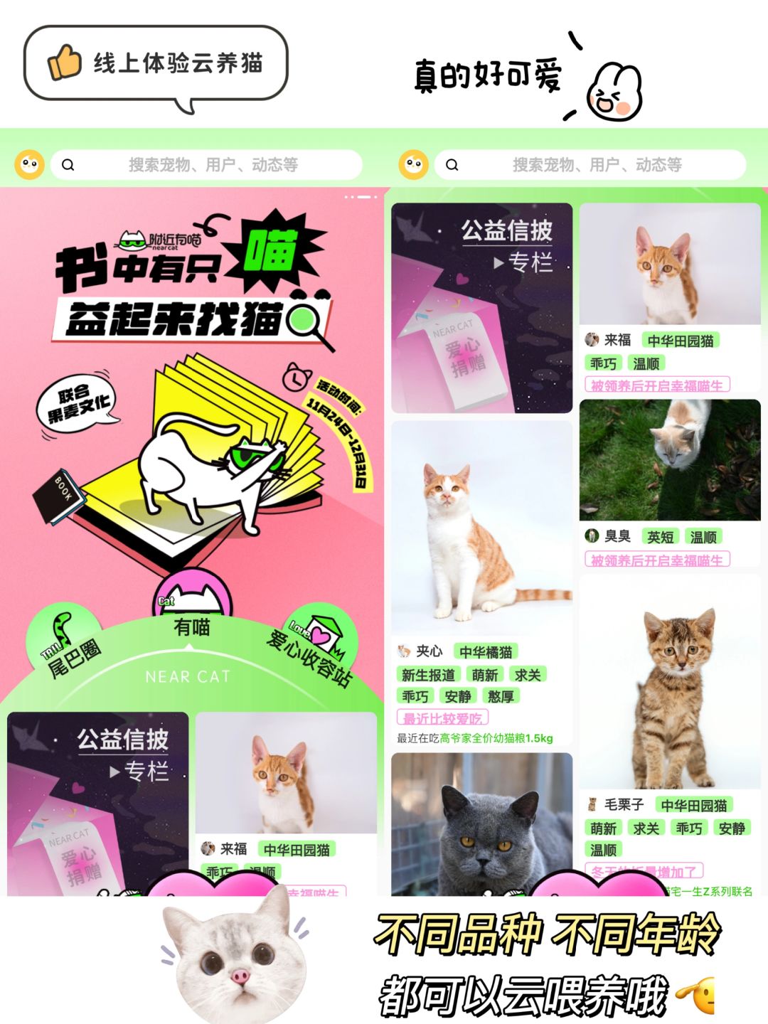 除了可以捐钱,这个APP居然还免费提供了流浪猫的领养和救助,帮助小猫咪找一个家,我看了一下,上面猫咪信息💻都挺全面的✅,如果有家人真的要养猫咪,不如去上面看看,给流浪猫咪一个家。