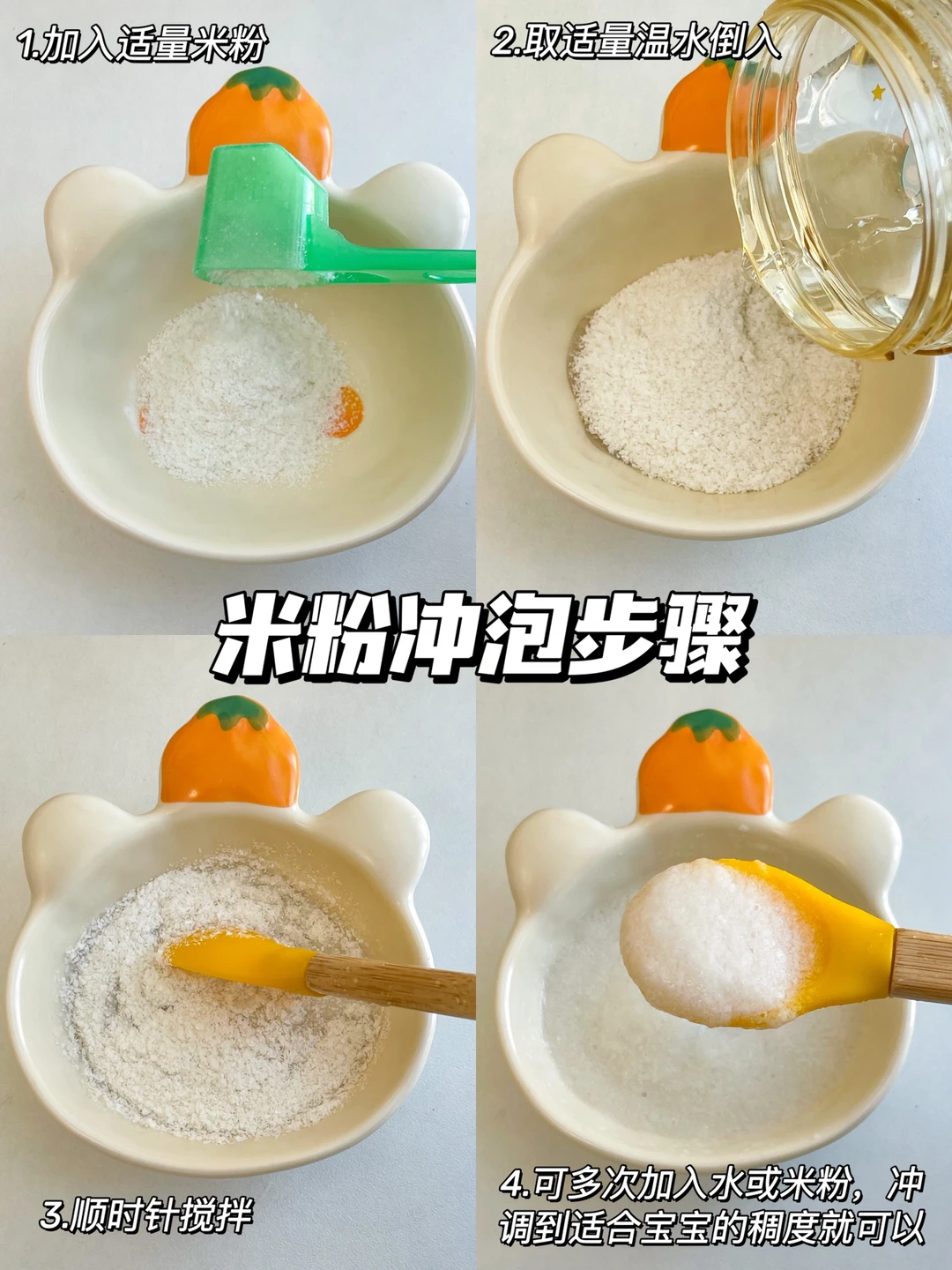 冲泡水温一般选择50°C左右,原则上先放水或先放米粉都是可以的。米粉的添加由稀到稠,由少到多,可以参考图。