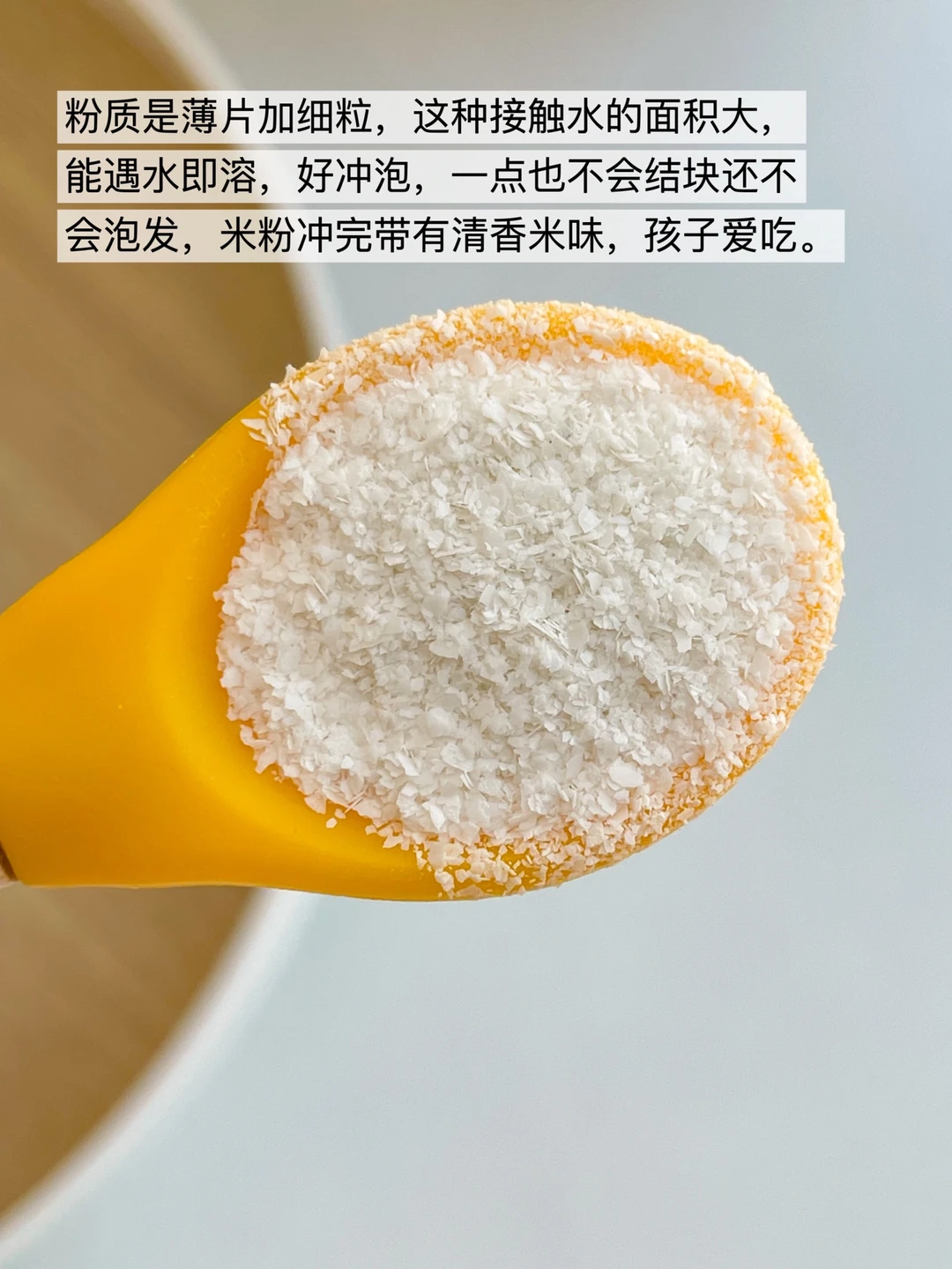 冲泡方面真的深得人心,粉质是那种小薄片加上细颗粒的,好冲泡不会结块还不会泡发。米粉冲泡完带有清香米味🍚,我家宝宝可喜欢吃了,你看整个脸都是圆嘟嘟的!很适合宝宝辅食。