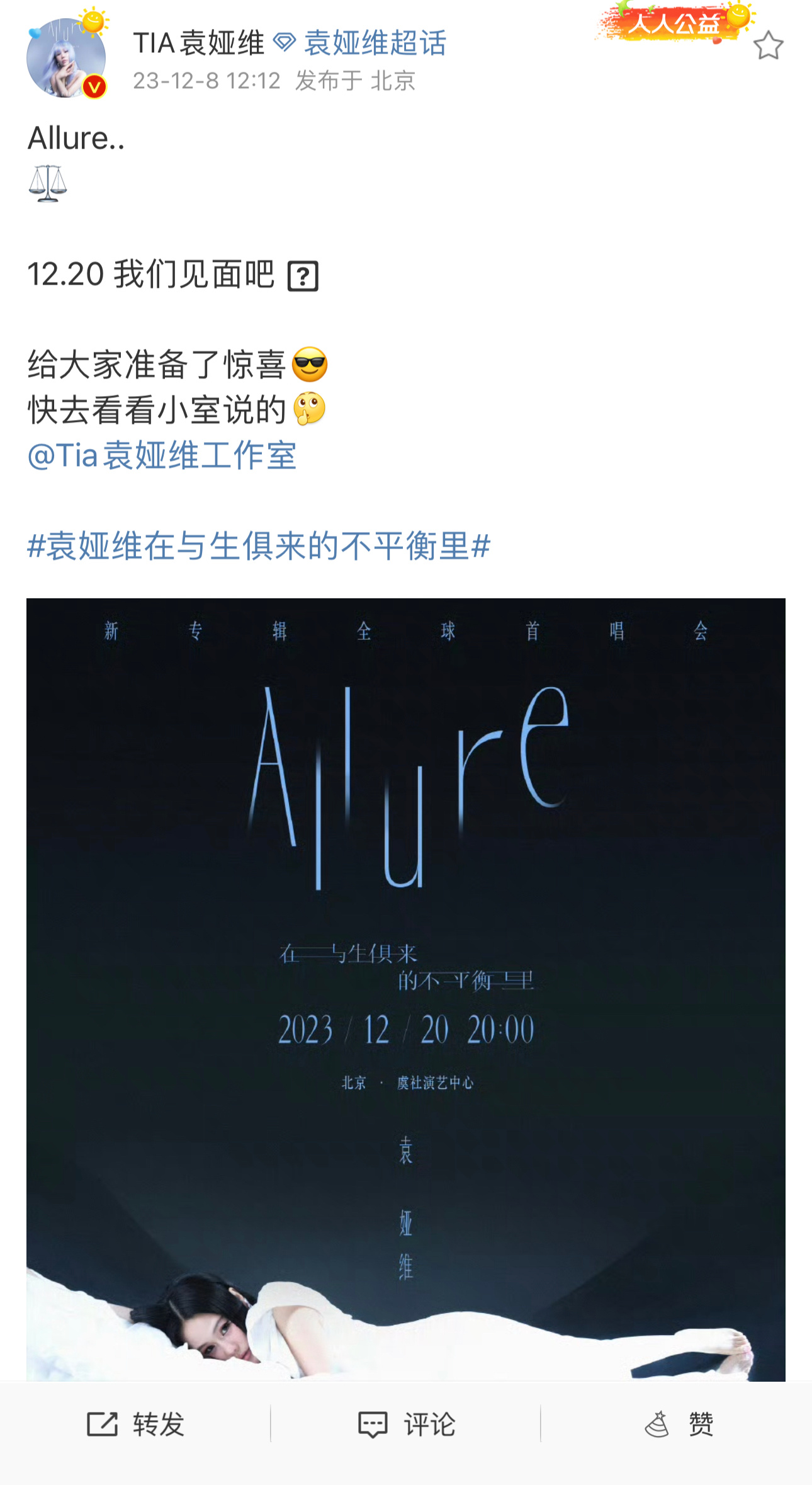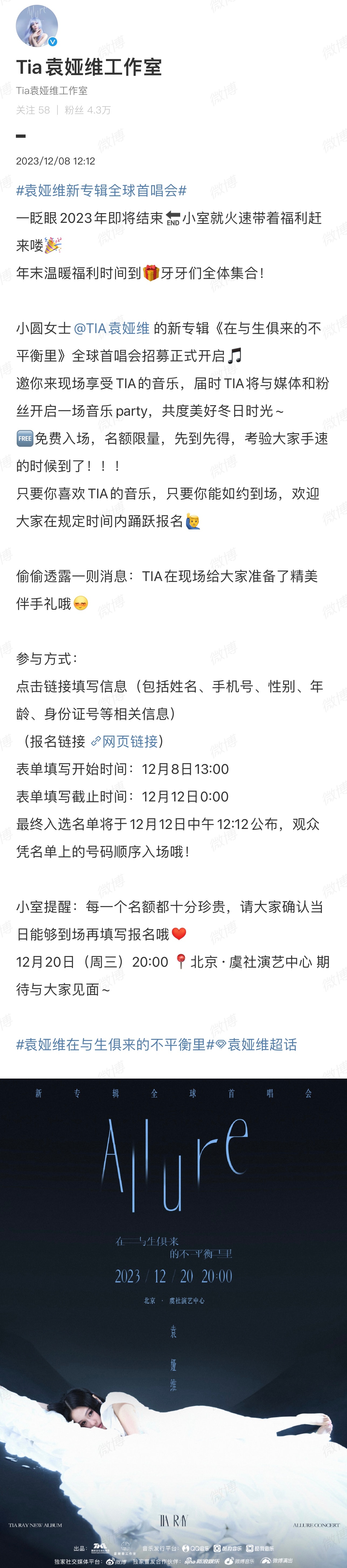#袁娅维居然免费请粉丝看首唱会# 袁娅维将于12月20日举办新专辑首唱会,请粉丝
